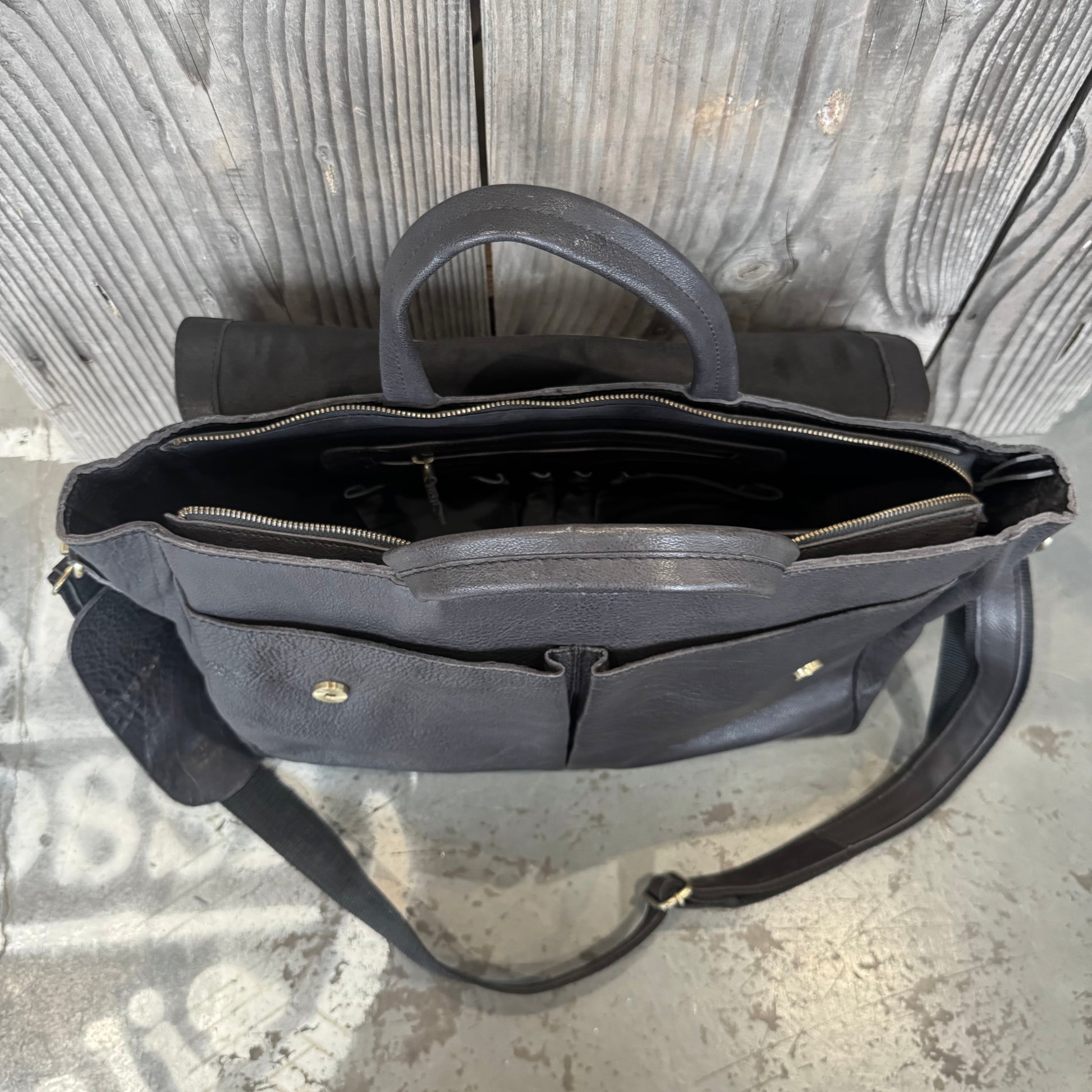 Lifting the leather front flap reveals a full-width zipper, providing security for the contents. The large main compartment features a separate padded area for your laptop, two open pockets for your phone and glasses and two pen holders. The open main area of the bag is spacious and includes a medium zippered pocket to keep safe those personal things.