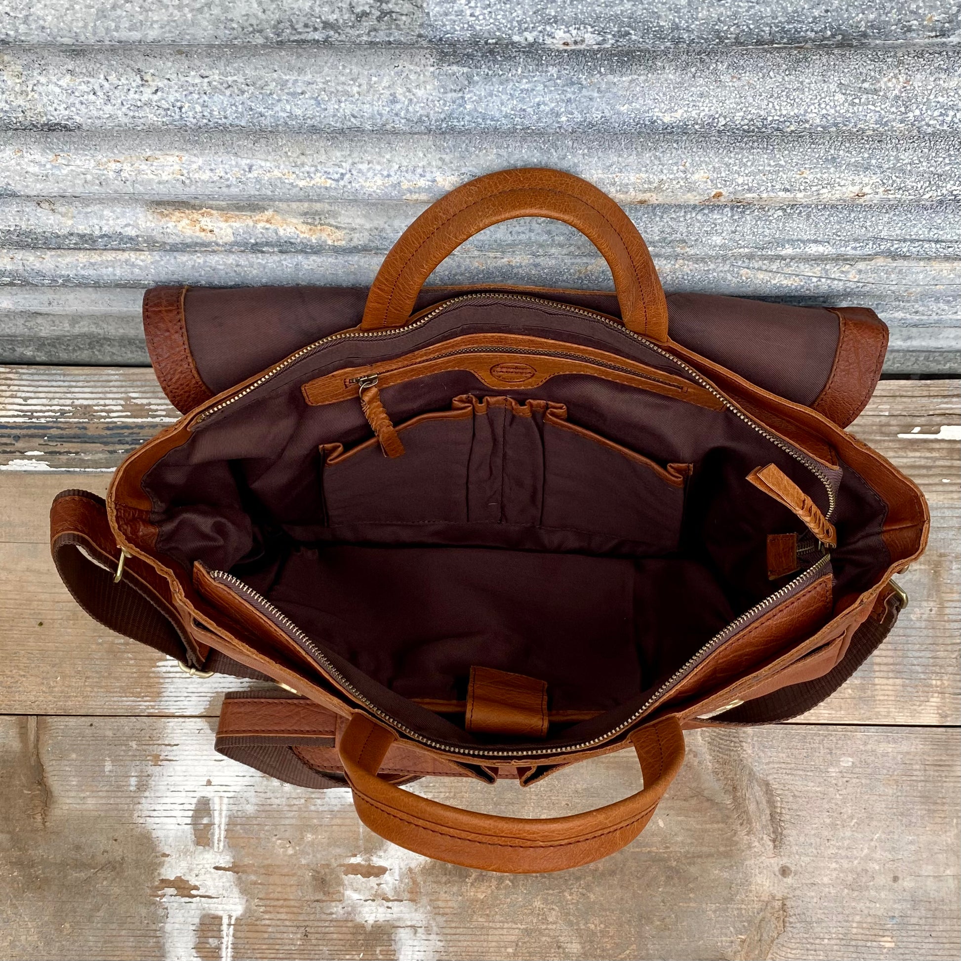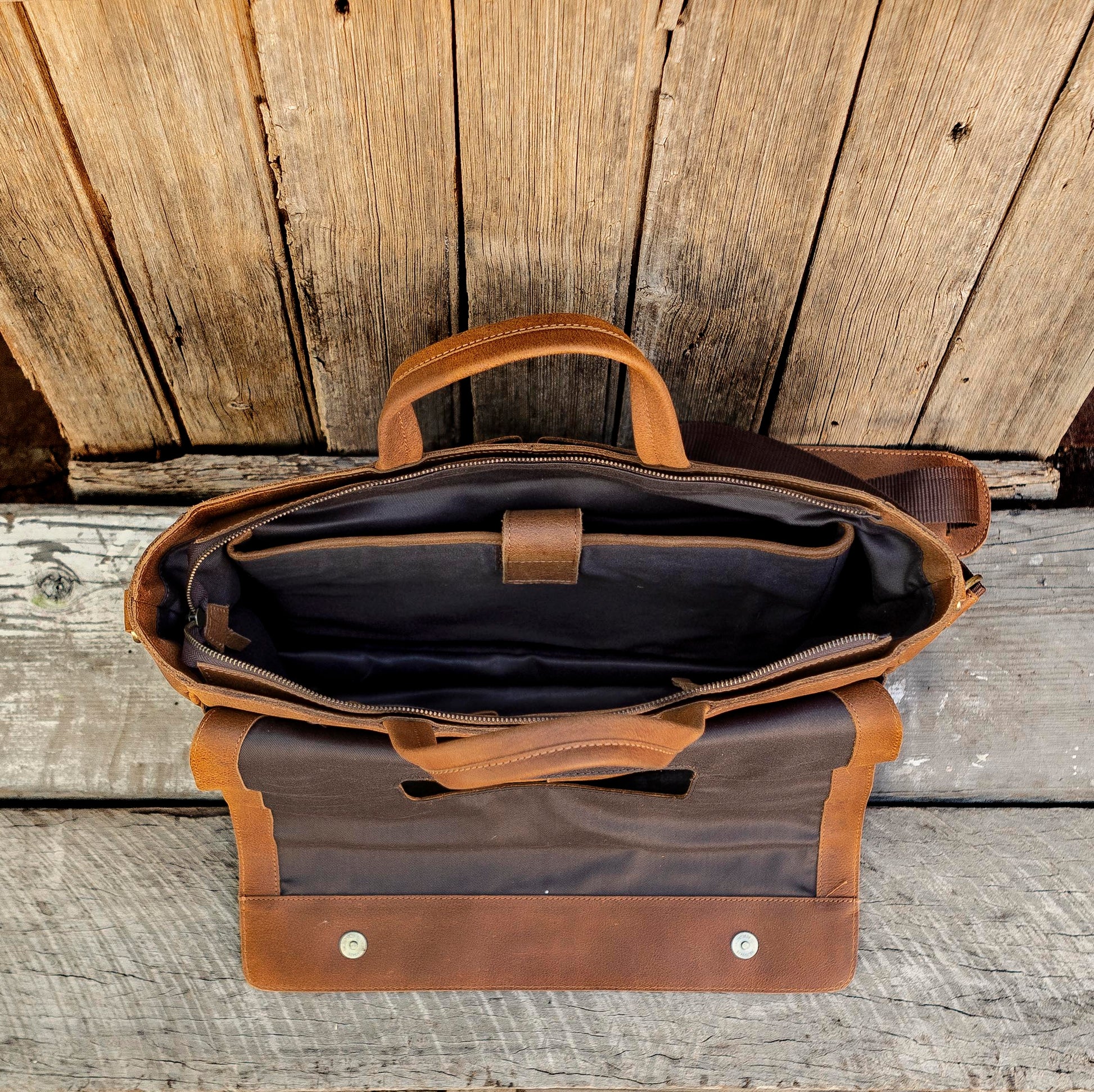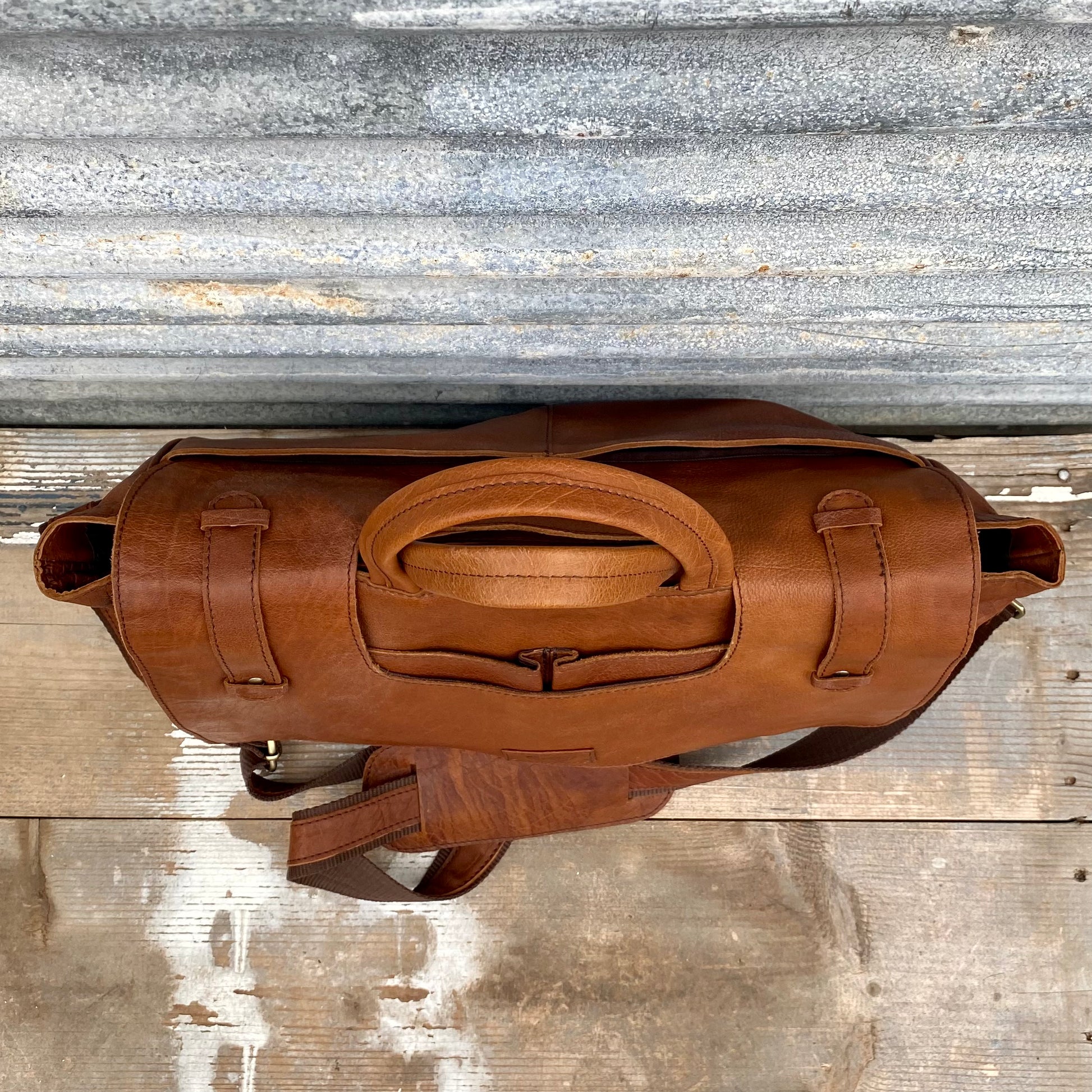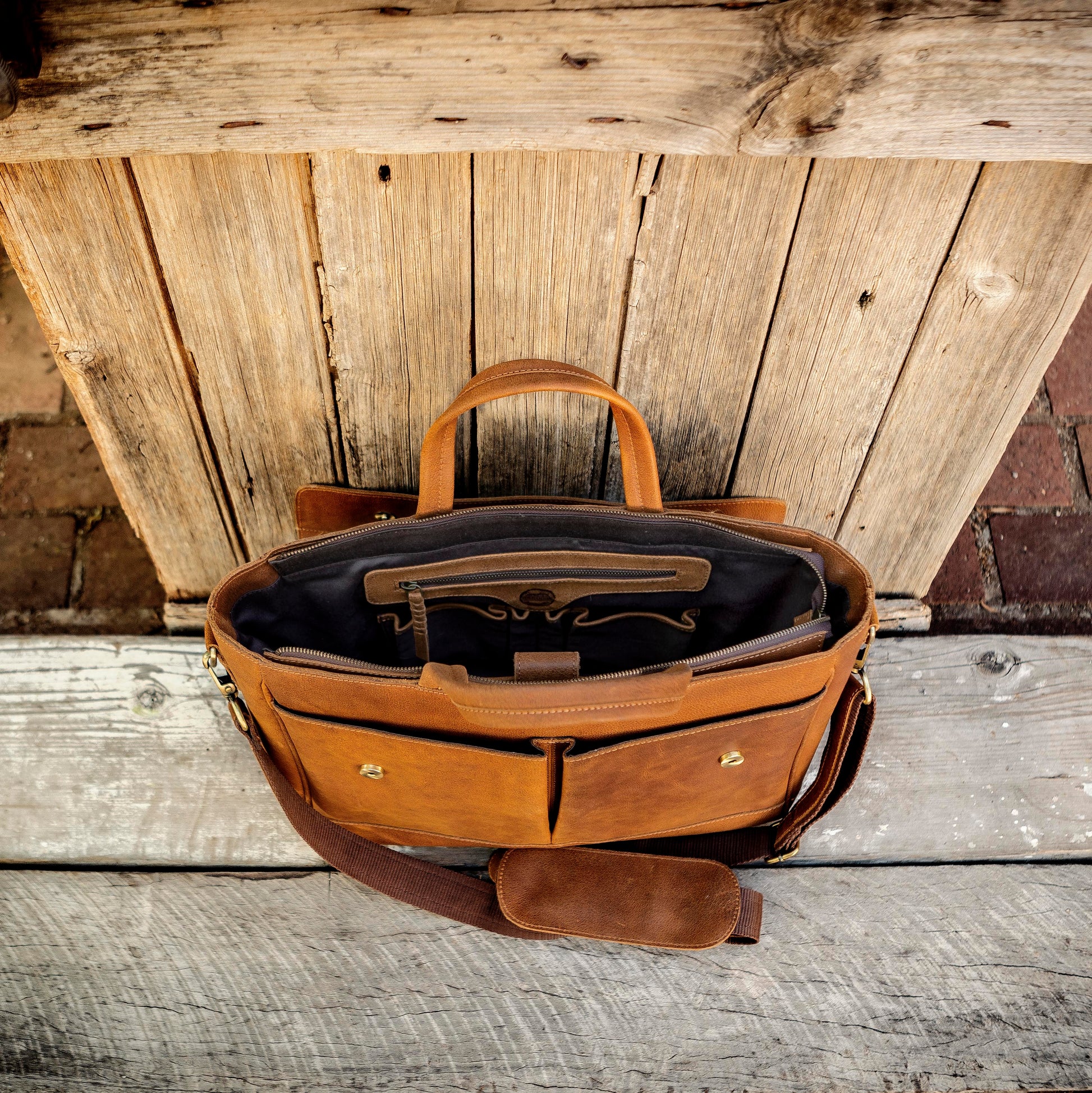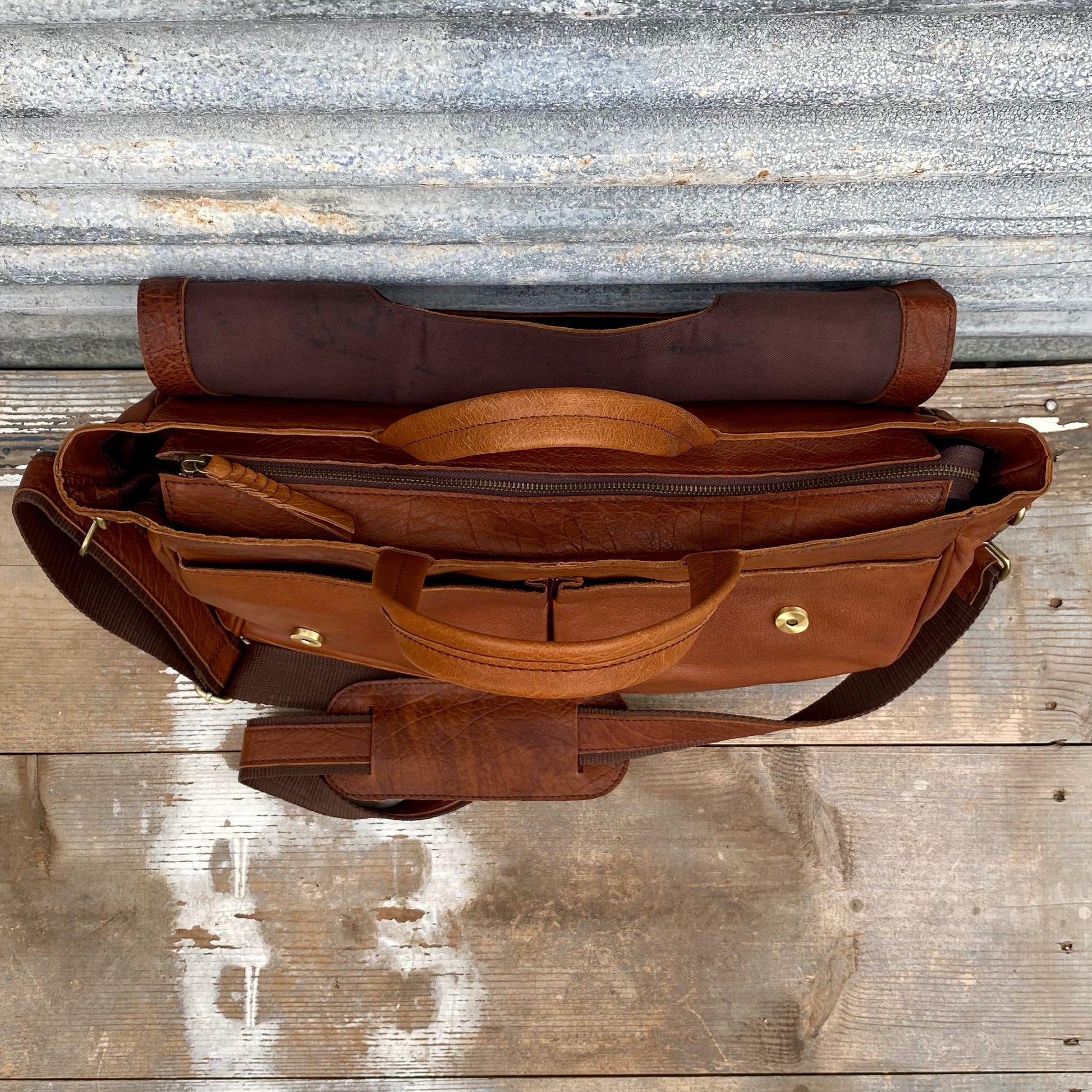 1. a large satchel made of tan buffalo leather used for work or travel with a padded area for a laptop.