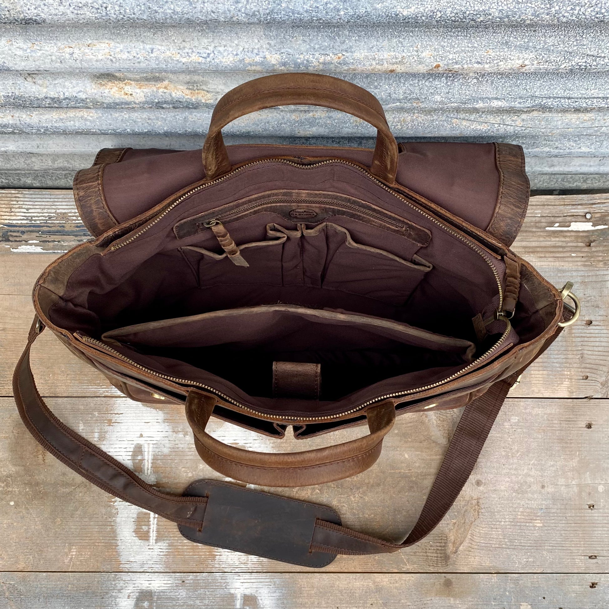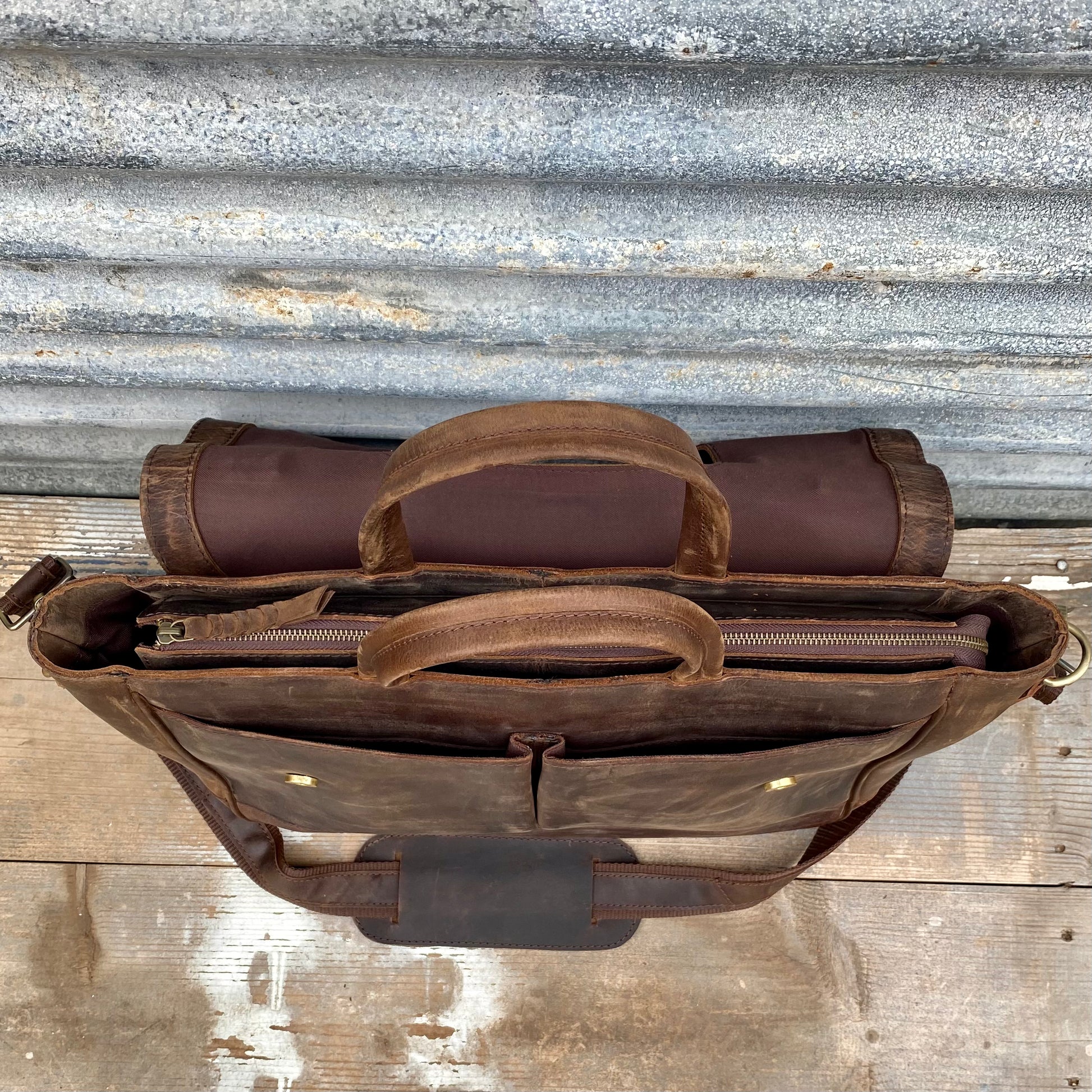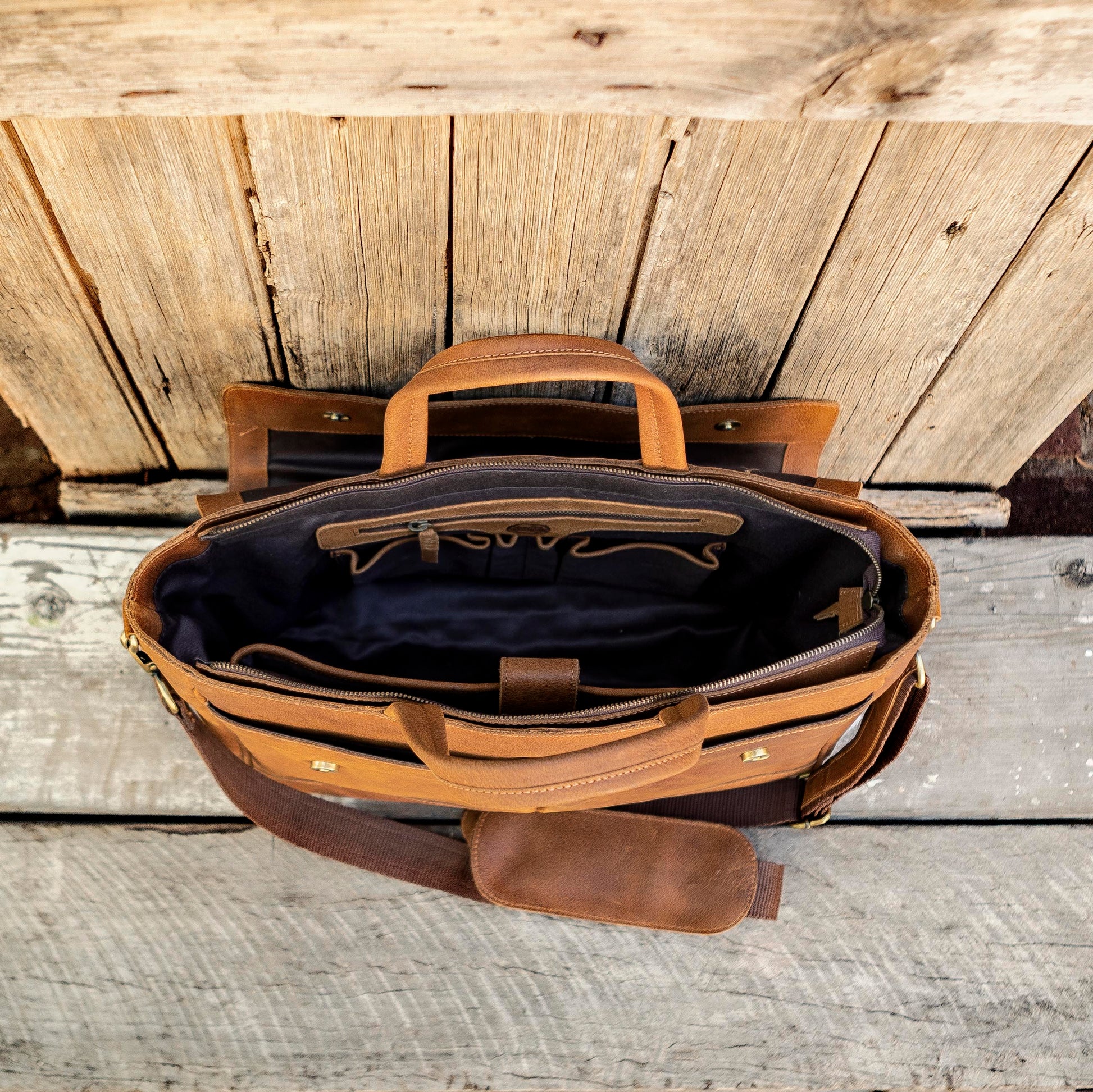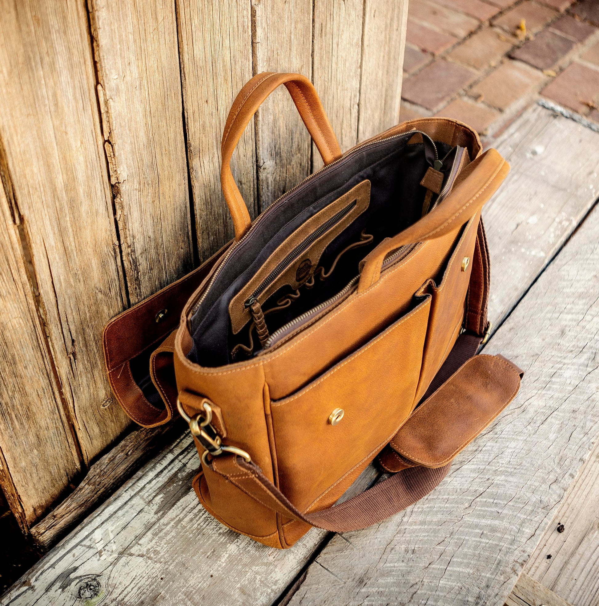 1. a large satchel made of tan buffalo leather used for work or travel with a padded area for a laptop.