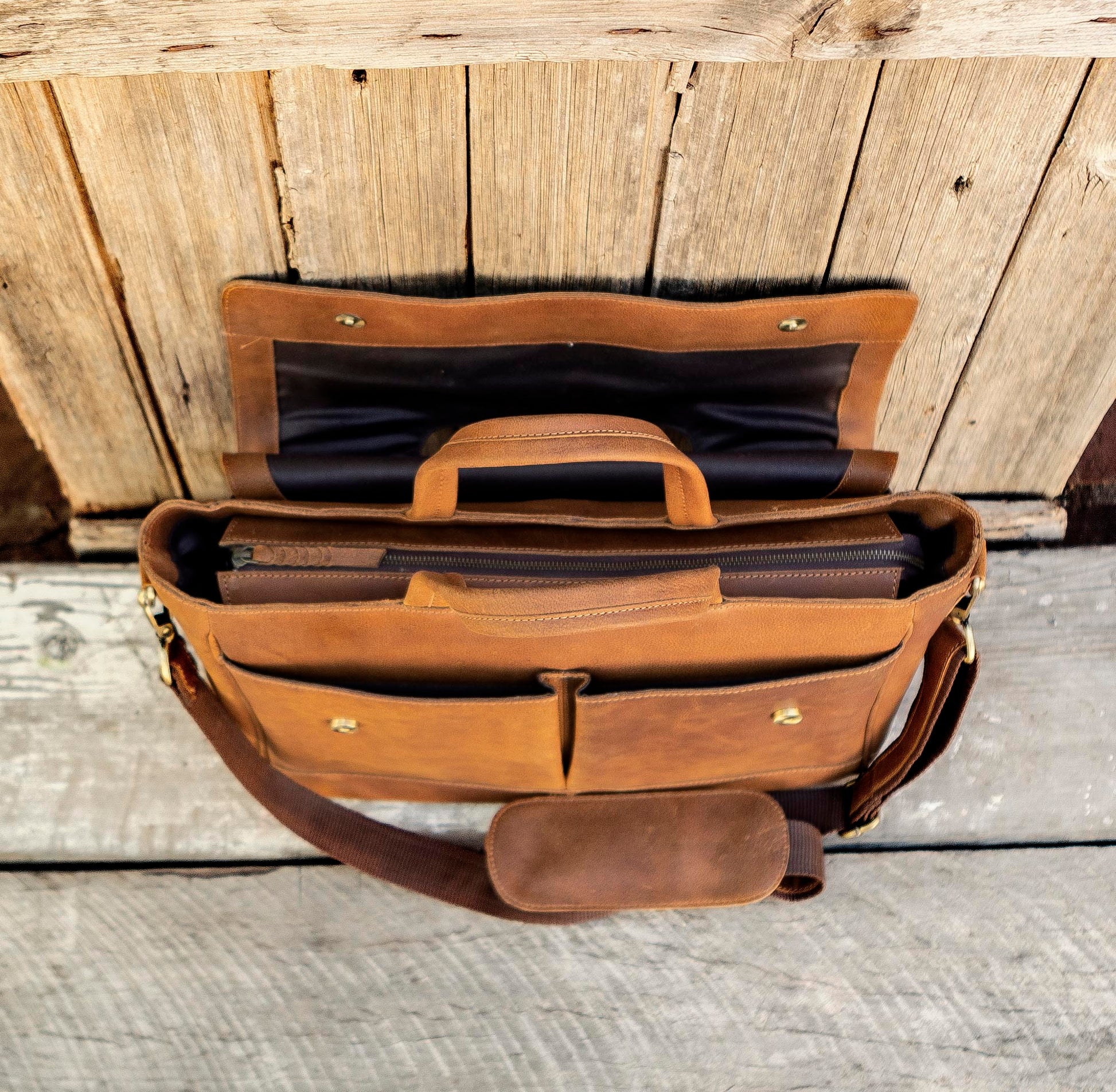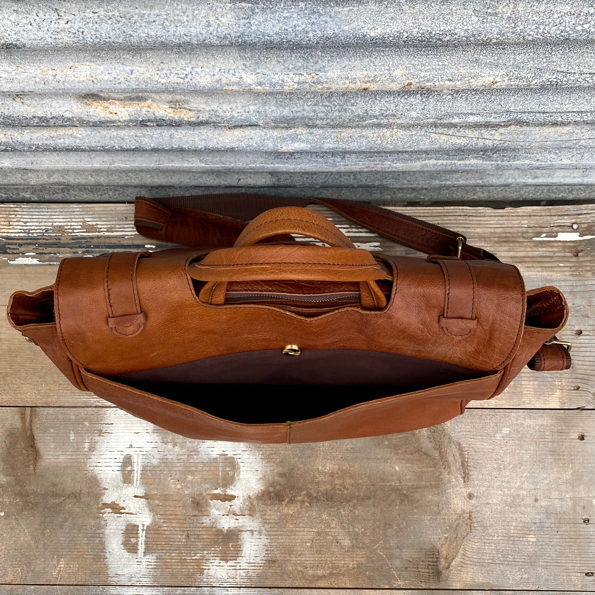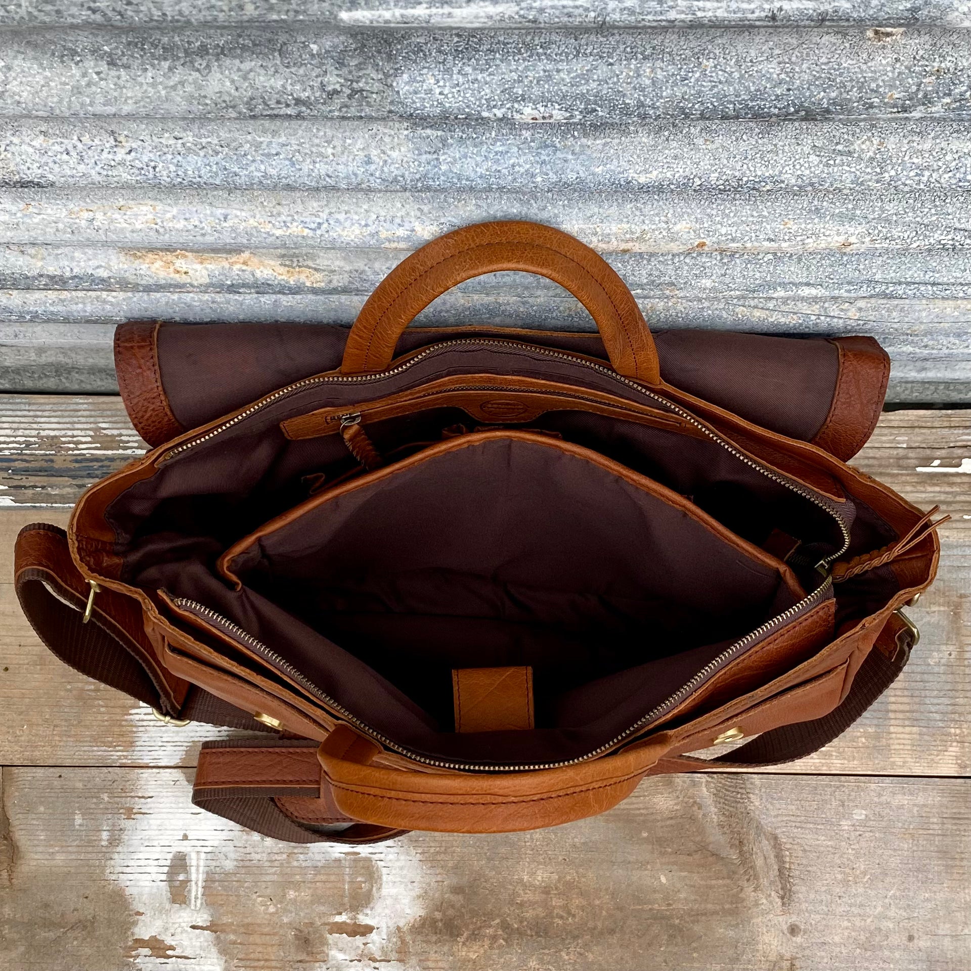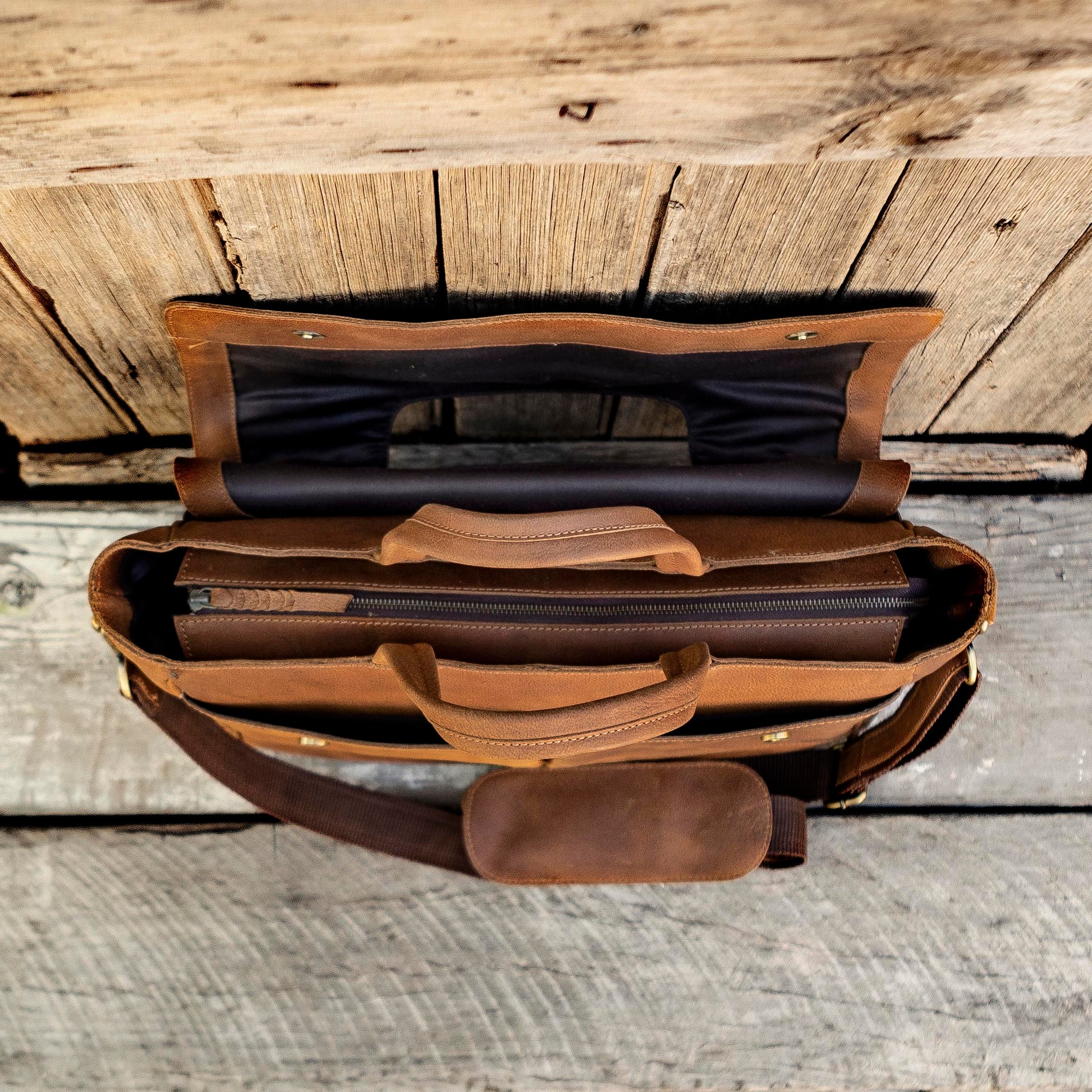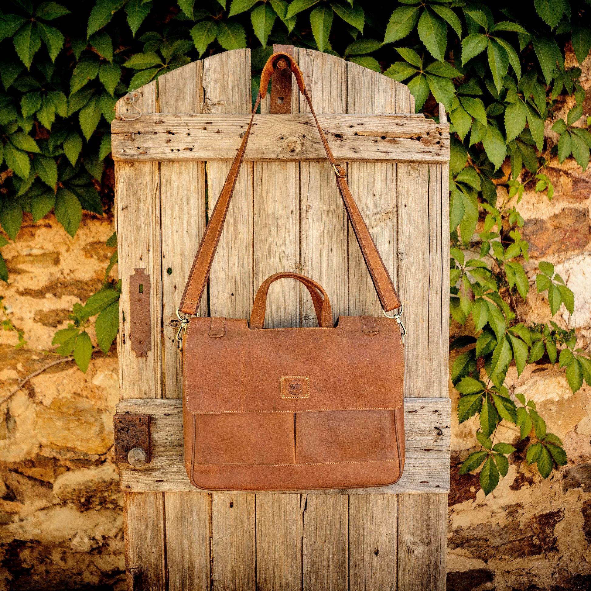 1. a large satchel made of tan buffalo leather used for work or travel with a padded area for a laptop.