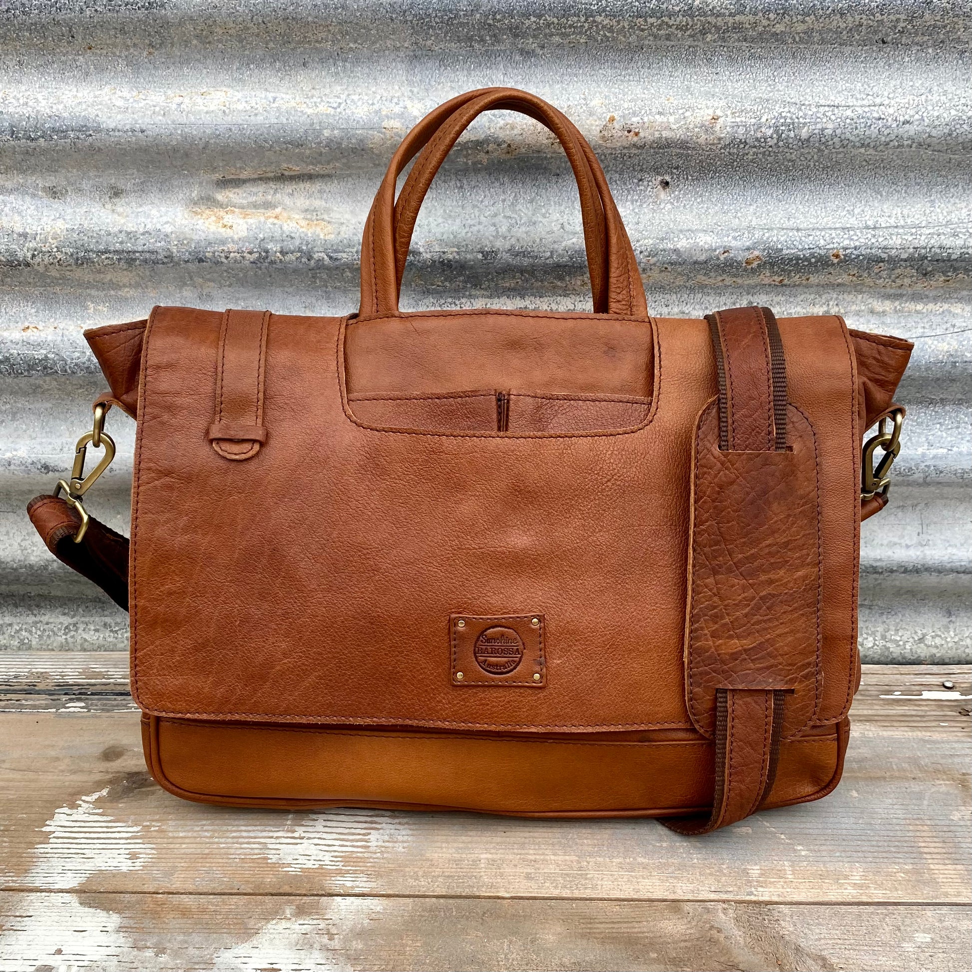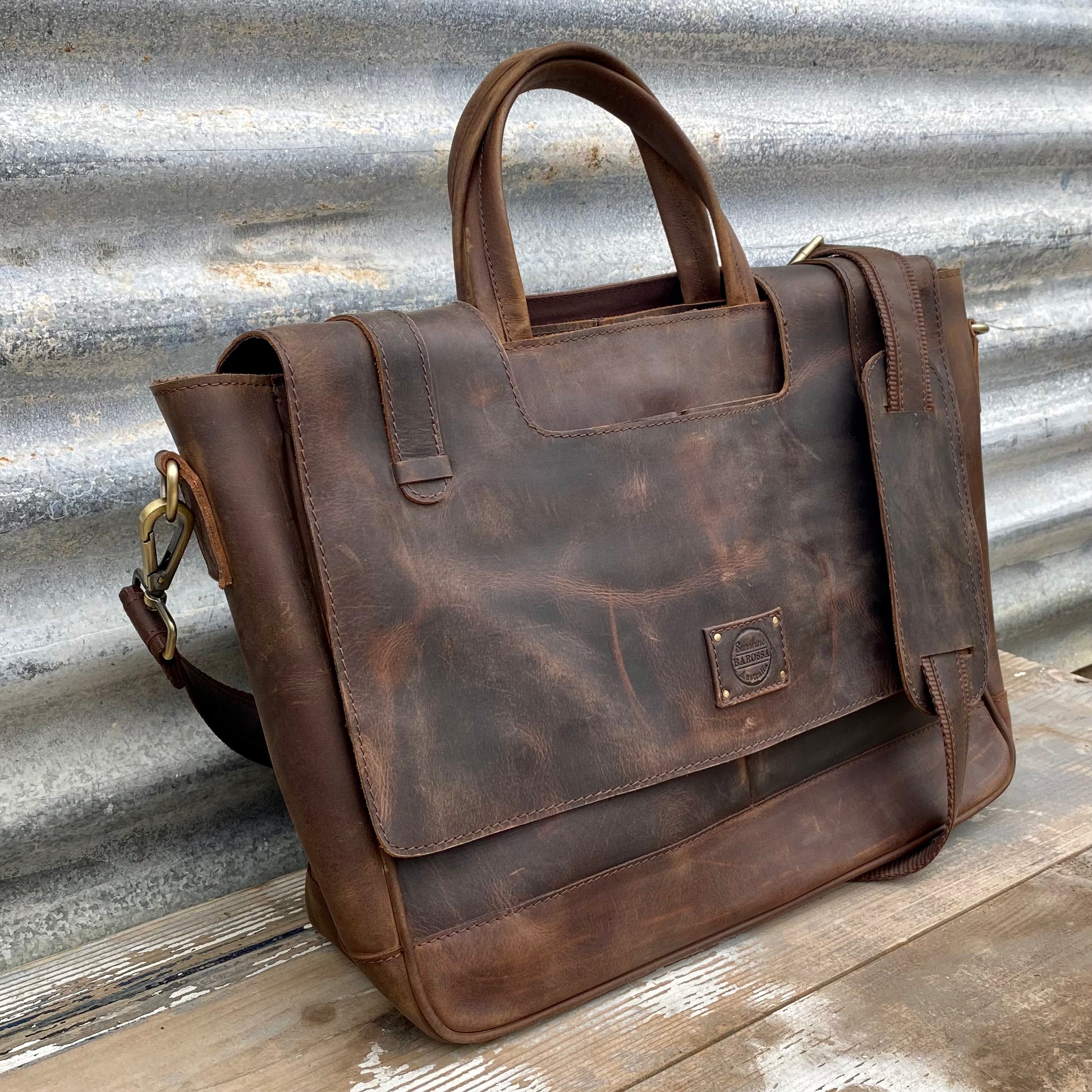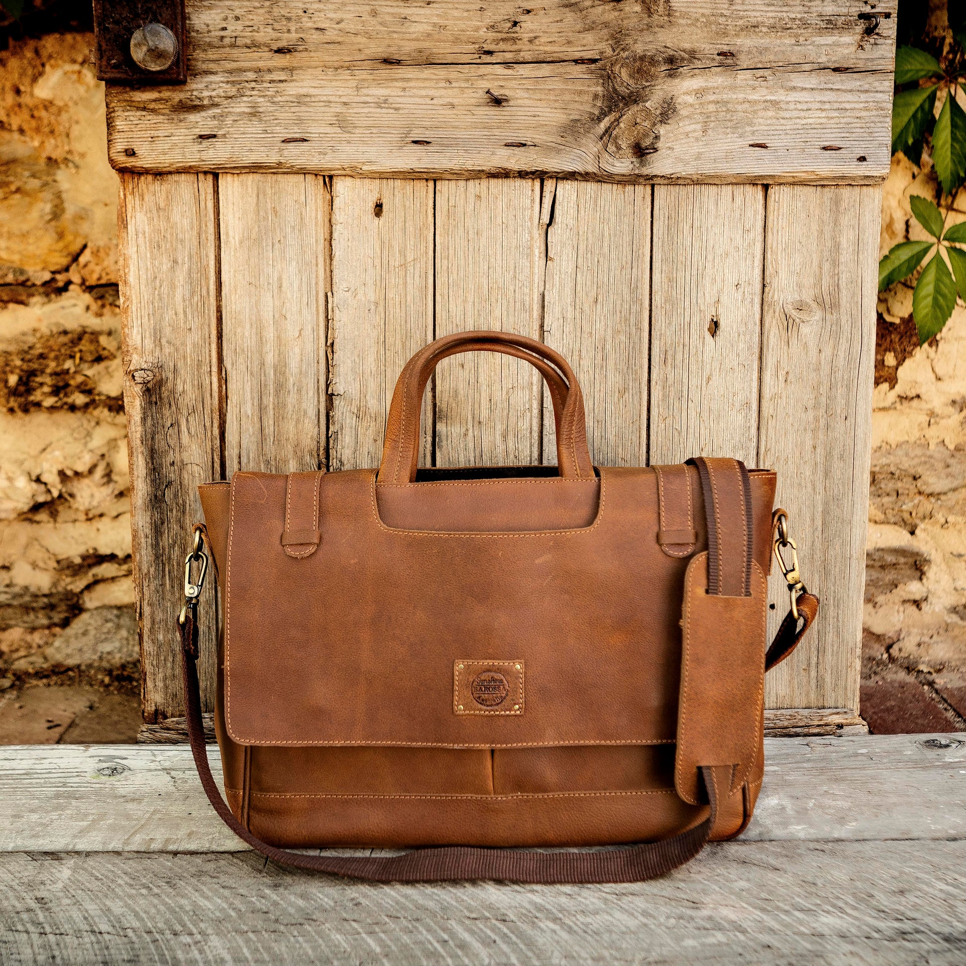 An exquisite piece of craftsmanship, the Buffalo Hide Laptop Satchel is the only work bag you will ever need. Crafted from gorgeous, durable Buffalo leather, this satchel, when properly cared for, is sure to see you through all your working days and beyond. Adorned with high quality heavy-duty antique brass hardware, a signature of Sunshine Barossa designs, this satchel will certainly last the distance.