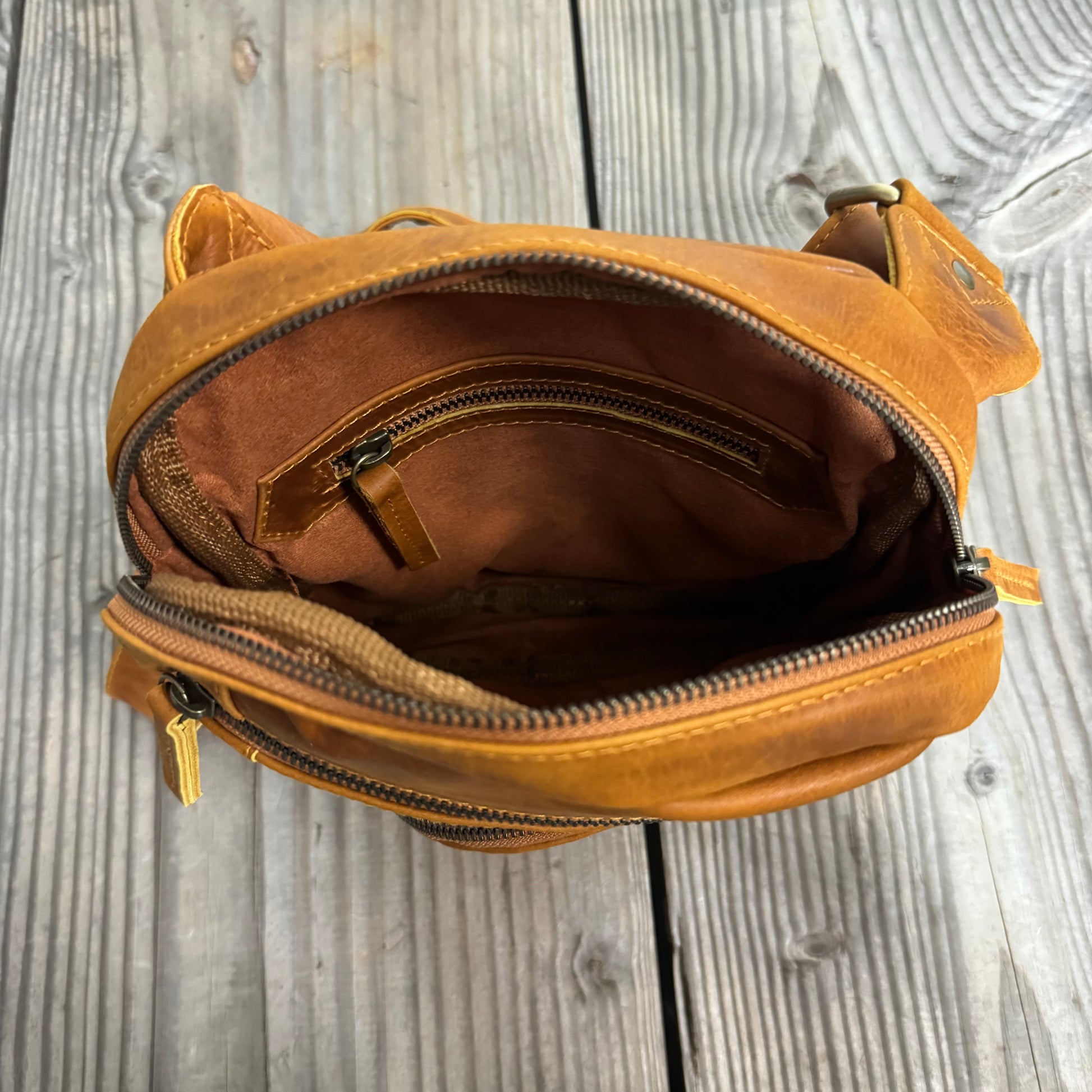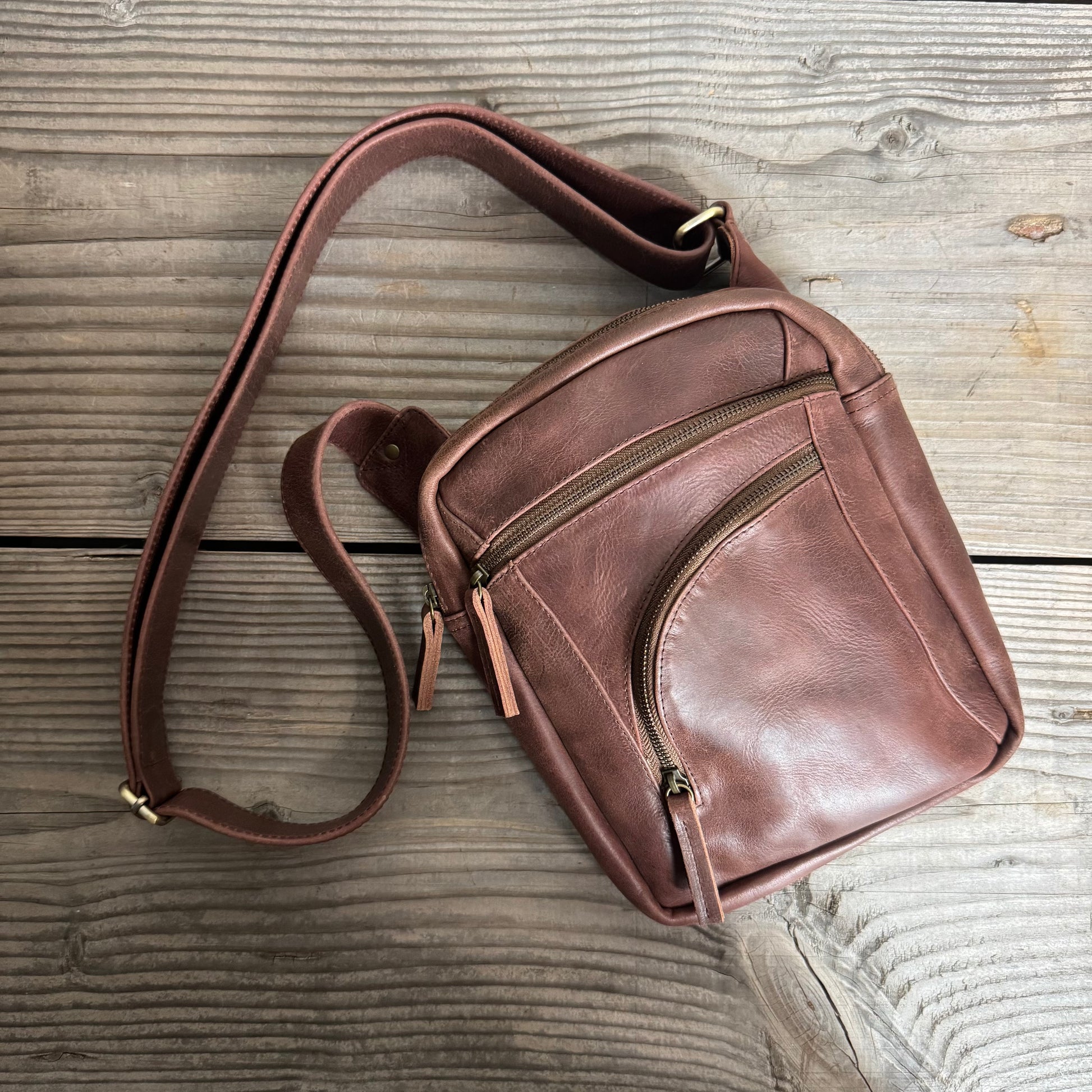 The Bobcat Bag is a compact bag that sits similarly to a sling bag by sitting around your body. It is crafted out of durable cow leather which wears beautifully over time and will last many years to come. Despite the compact size, it is shaped in a way that will still hold many belongings and has 4 zipper pockets for security and organisation.