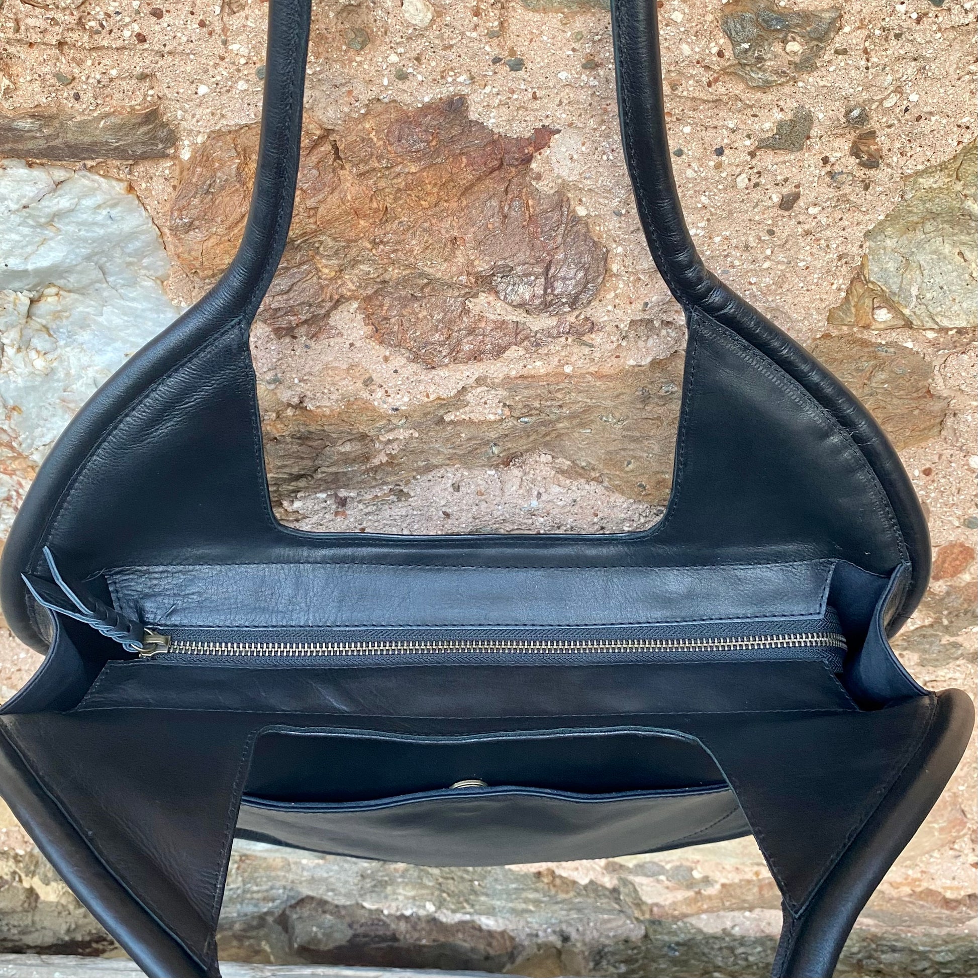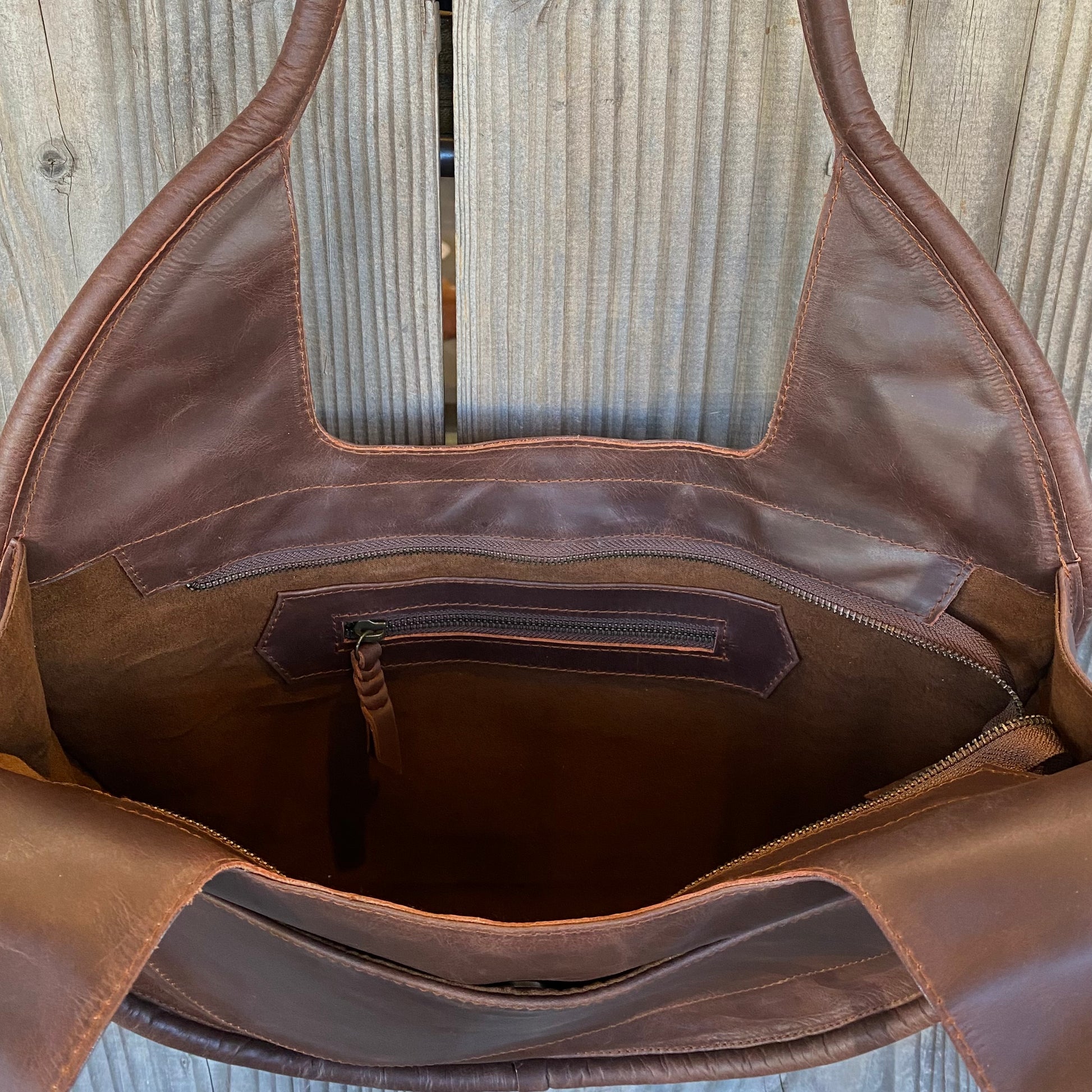 36cm metal zippered opening to the bag with plated leather zipper pull