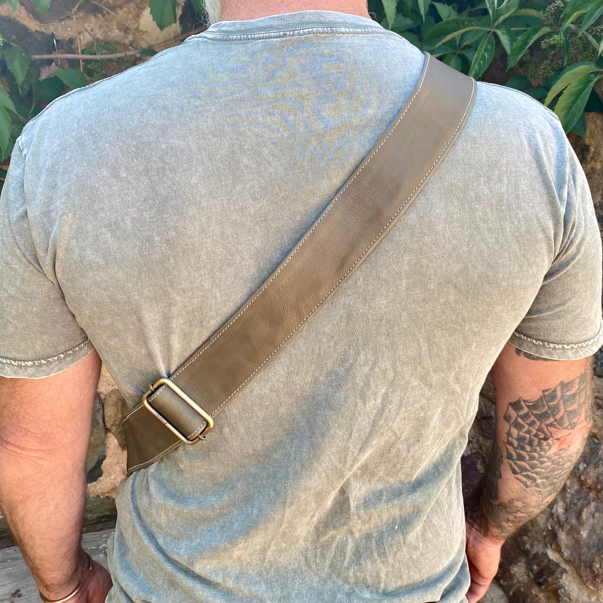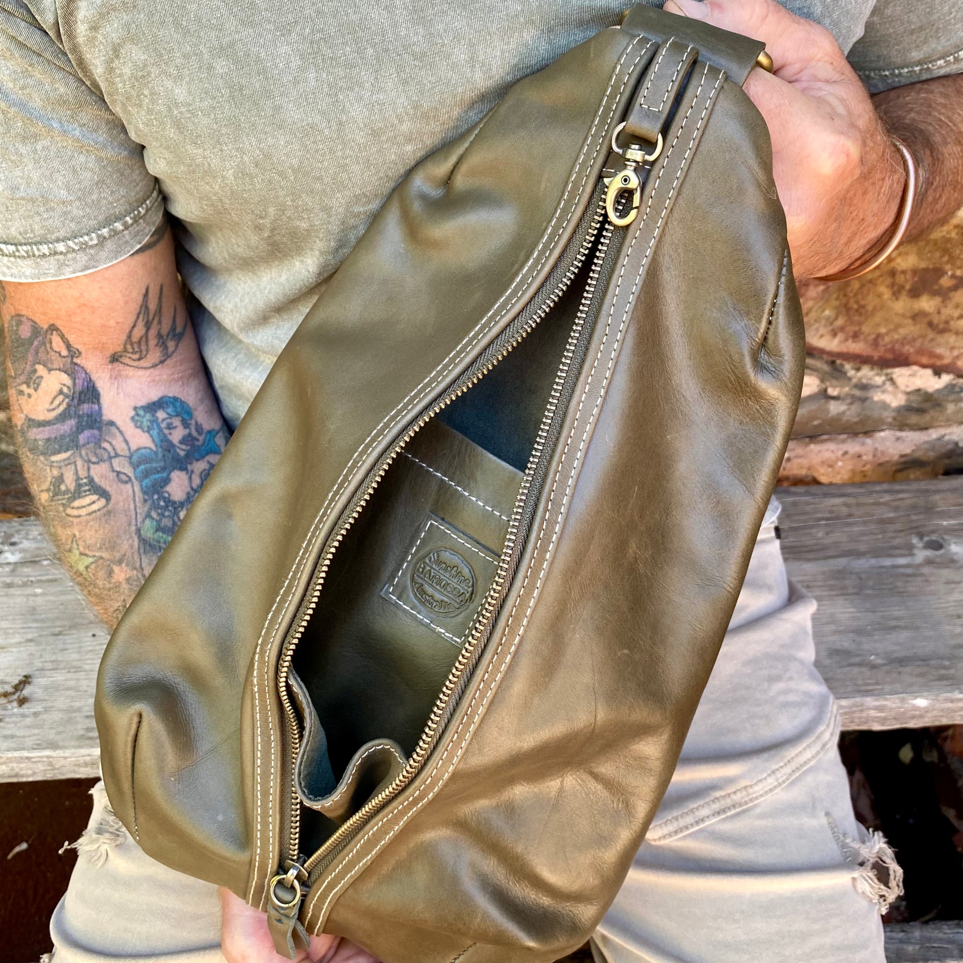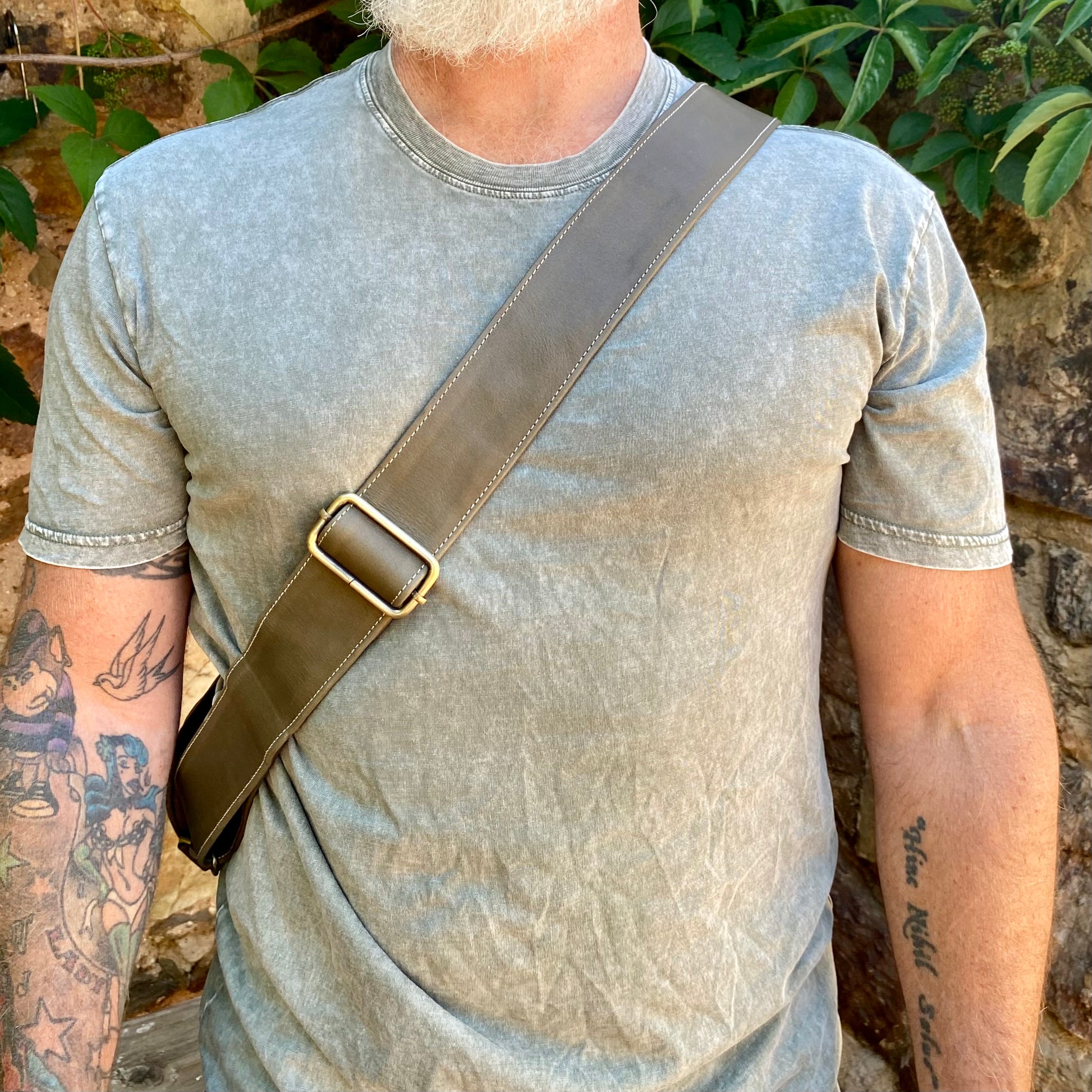 With Jason's help in collaboration this impressive leather sling / chest bag was created. An item he personally now wears daily designing it how he prefers a bag to look and be functional. Simplistic lines is what he visually likes to see, so with these vintaged leathers used, contrast stitching and a detachable wide strap you can wear on either side which is also perfect for lefties and righties. Also with your security in mind, there is a subtle metal clip on a leather tab to clip your zipper closed if wearing on your back.