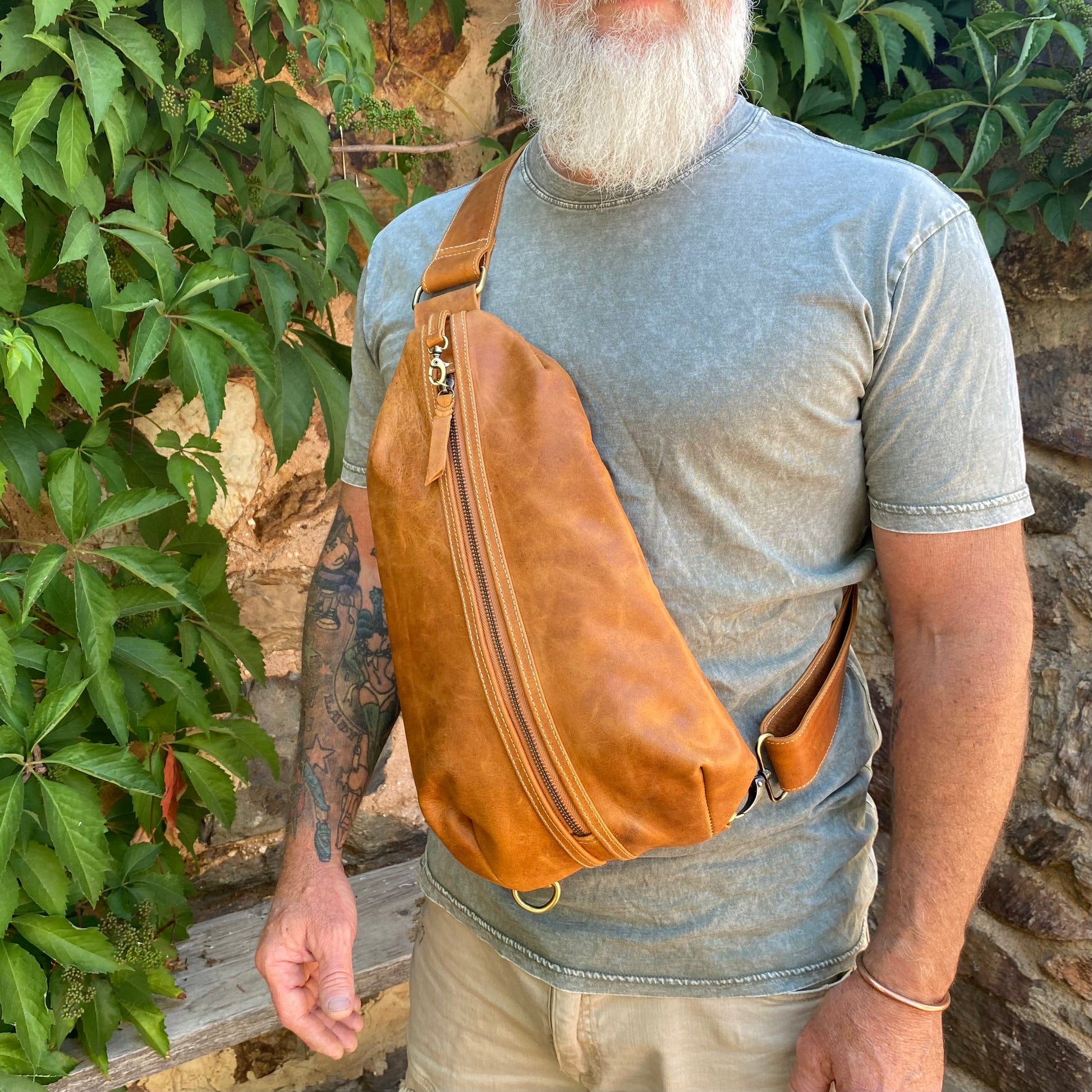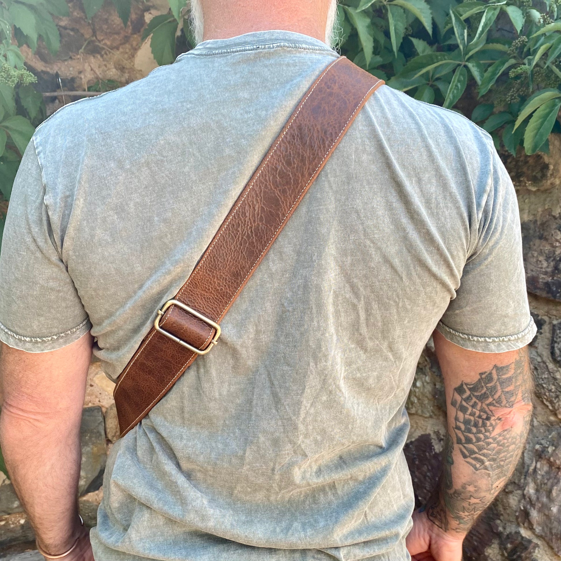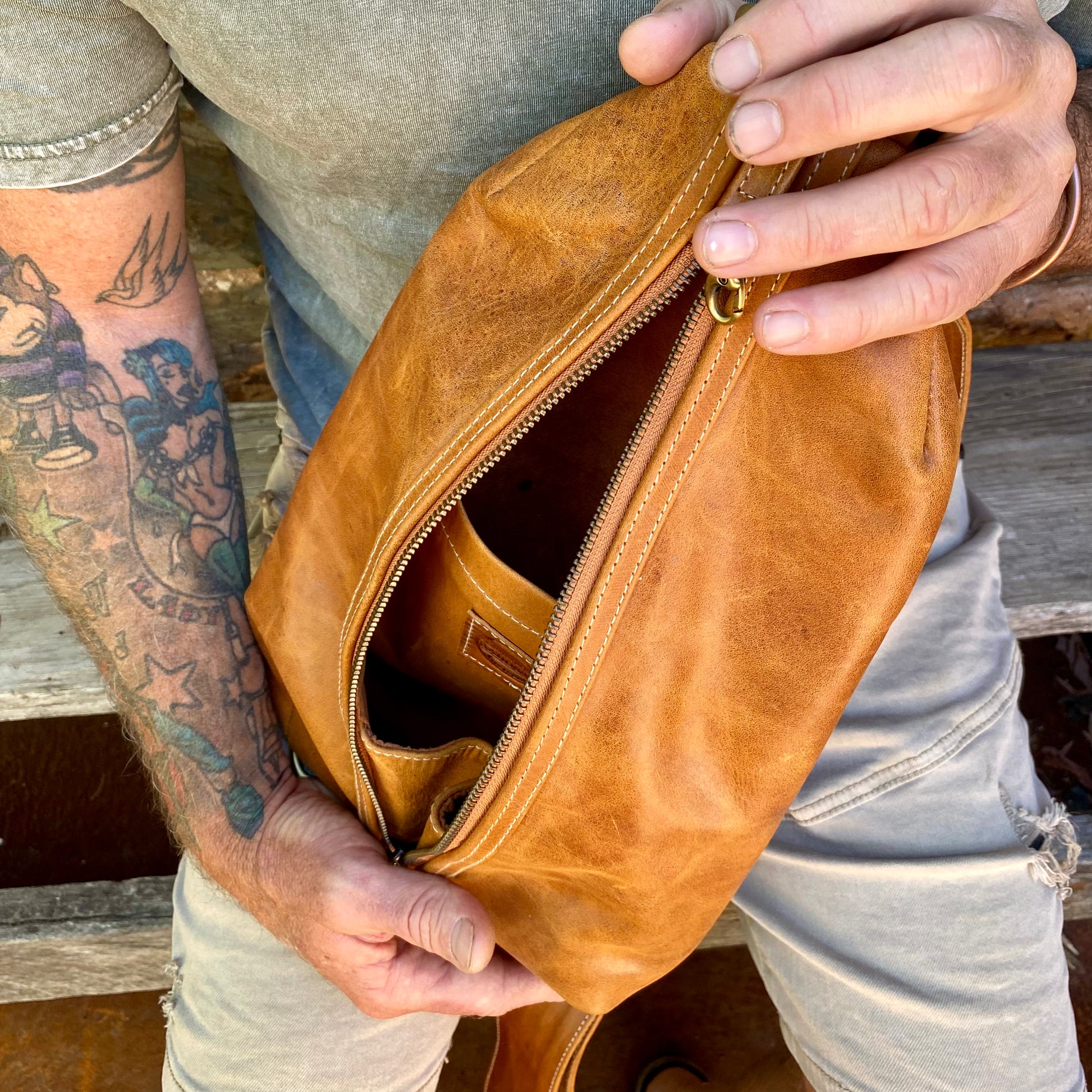 With Jason's help in collaboration this impressive leather sling / chest bag was created. An item he personally now wears daily designing it how he prefers a bag to look and be functional. Simplistic lines is what he visually likes to see, so with these vintaged leathers used, contrast stitching and a detachable wide strap you can wear on either side which is also perfect for lefties and righties. Also with your security in mind, there is a subtle metal clip on a leather tab to clip your zipper closed if wearing on your back.