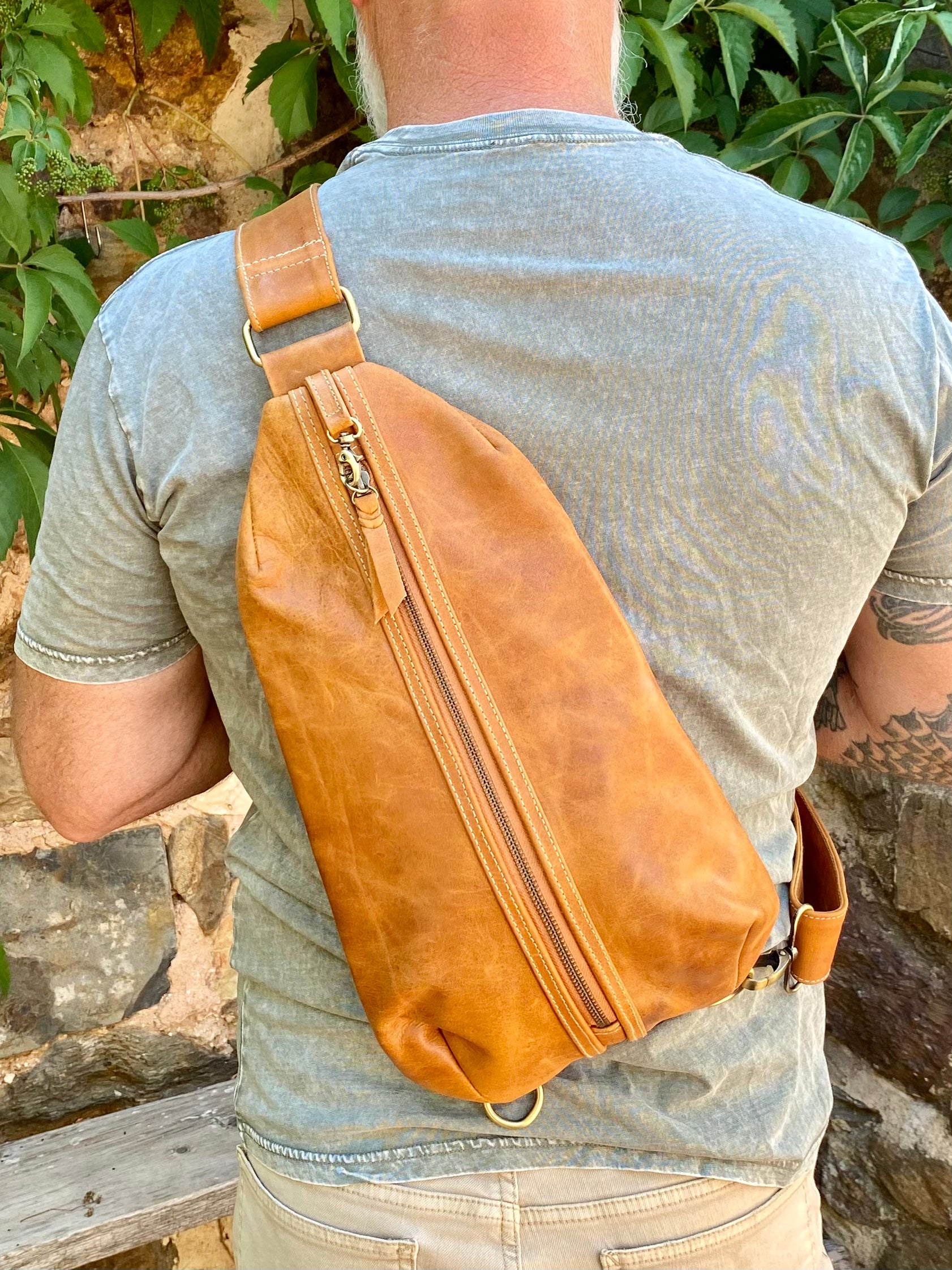 This Sling / Chest bag has a deceptively large amount of space and will carry a lot more than you think, whilst leaving your hands conveniently free. Whether you're off to work, study, travel or play it will get you anywhere you need to go and is sure to turn heads and draw compliments wherever you find yourself. Handsome, practical and sturdy, this Jason Leather Sling / Chest Bag will ‘have your back’ for years to come.