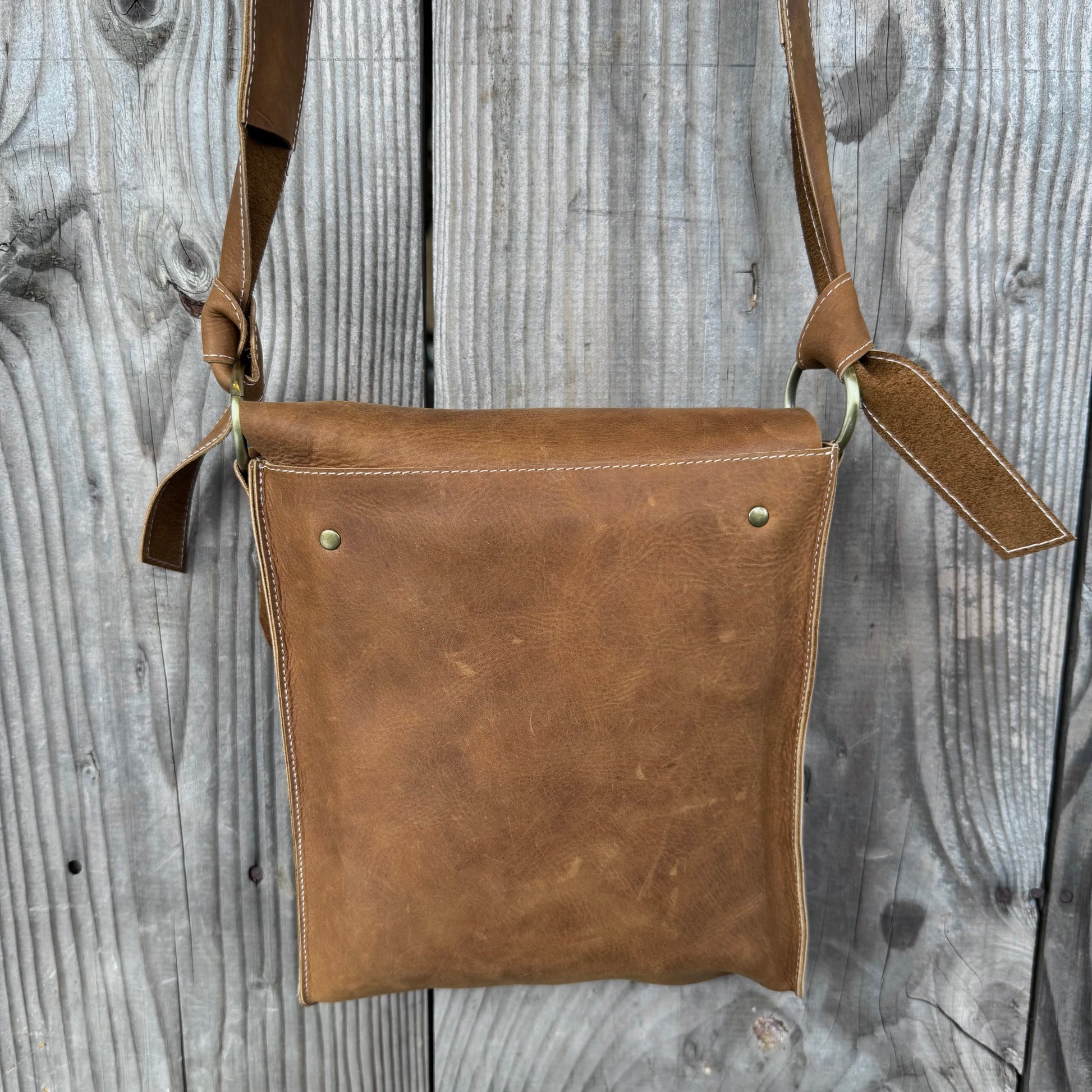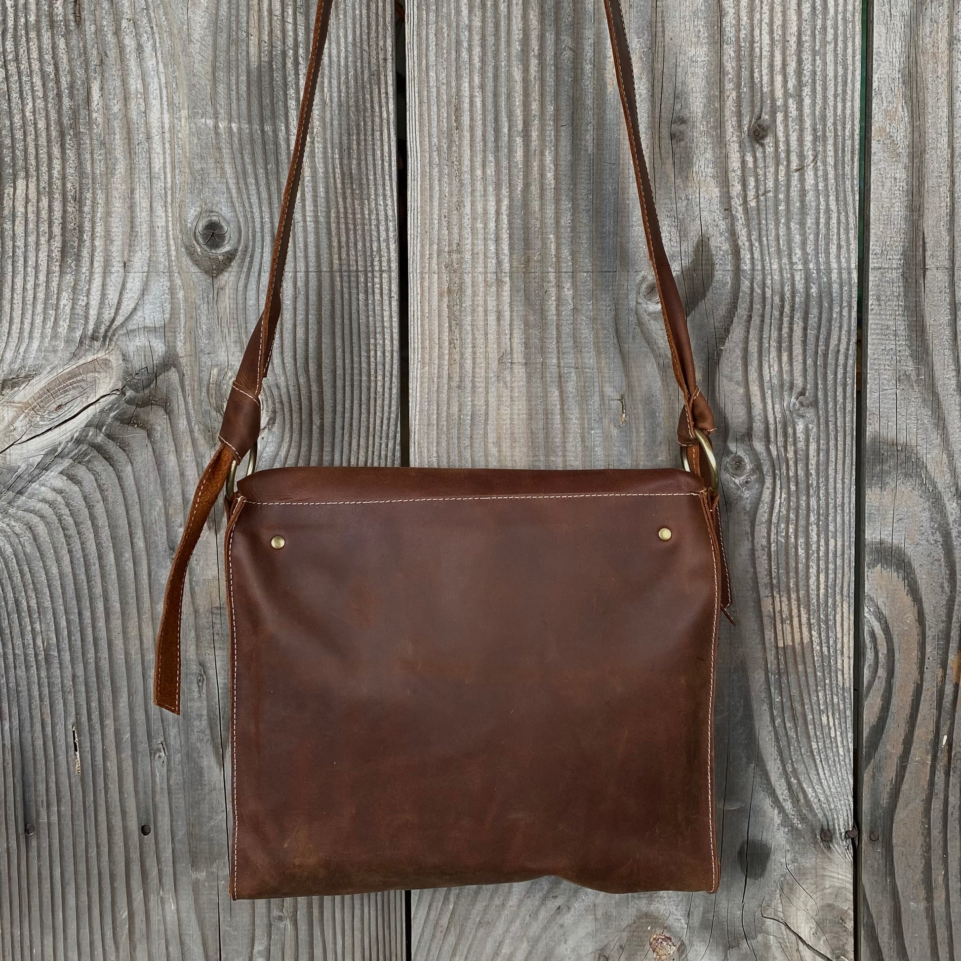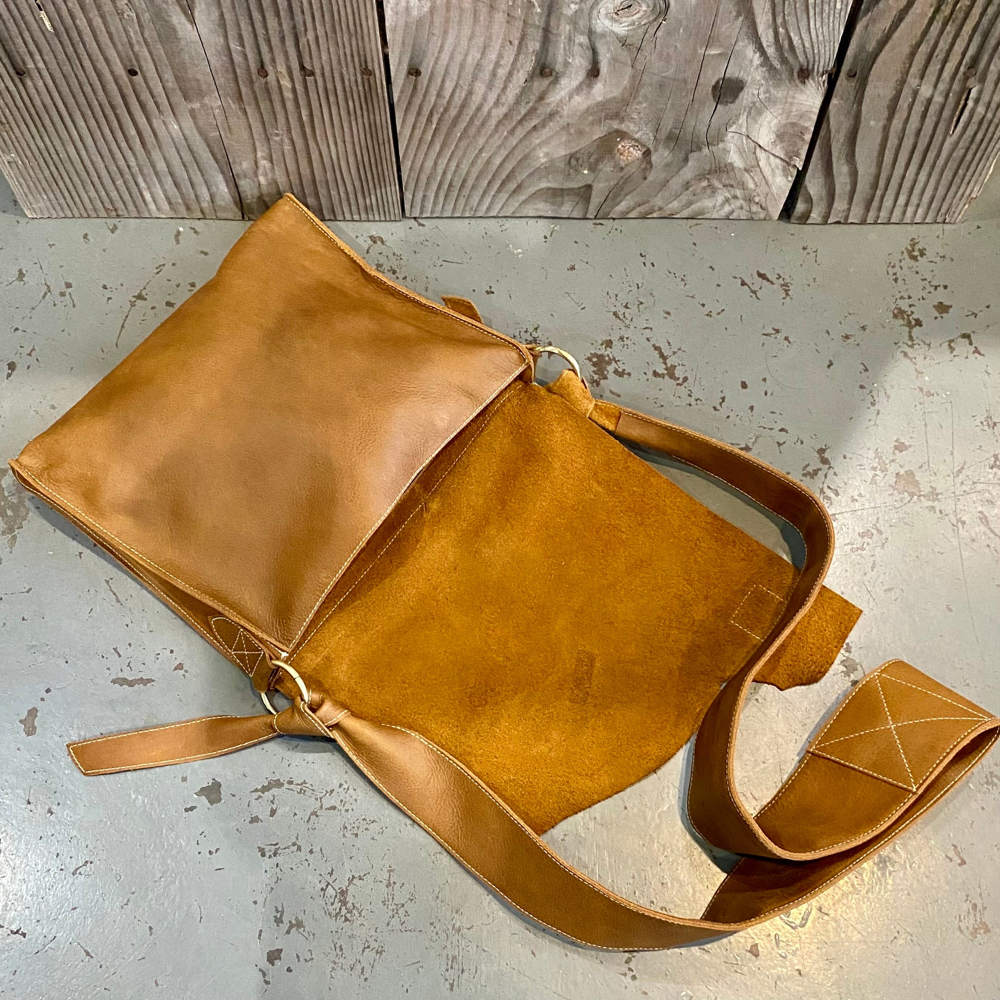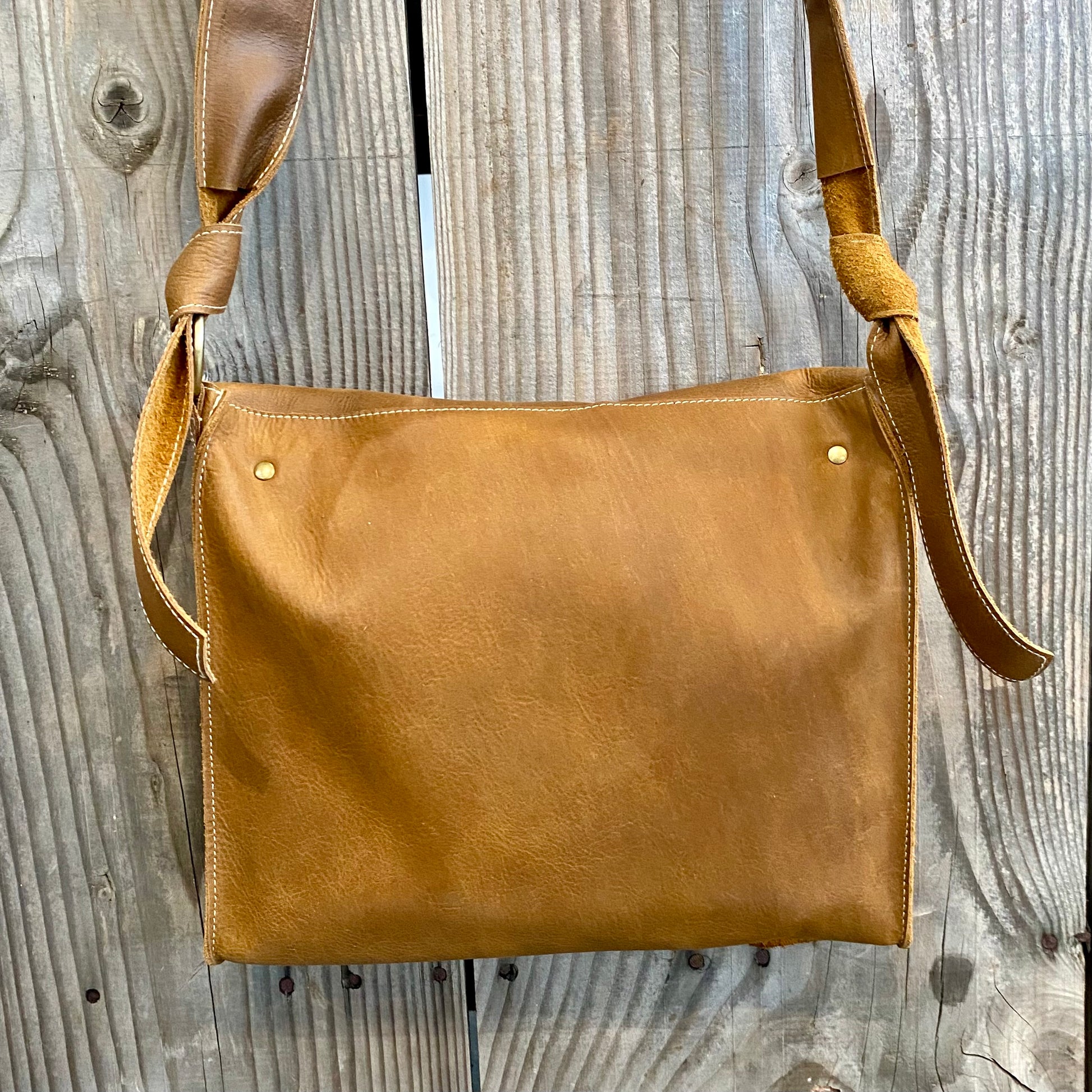 These satchels sit across the body with ease with a wide leather strap for comfort. The straps are wider in the middle and tapered towards the ends so they can be knotted onto the antique brass rings. This is the way you adjust the strap to suit exactly how you want to wear it and the soft durable leather will mold to your body to give you a very comfortable-to-wear bag.