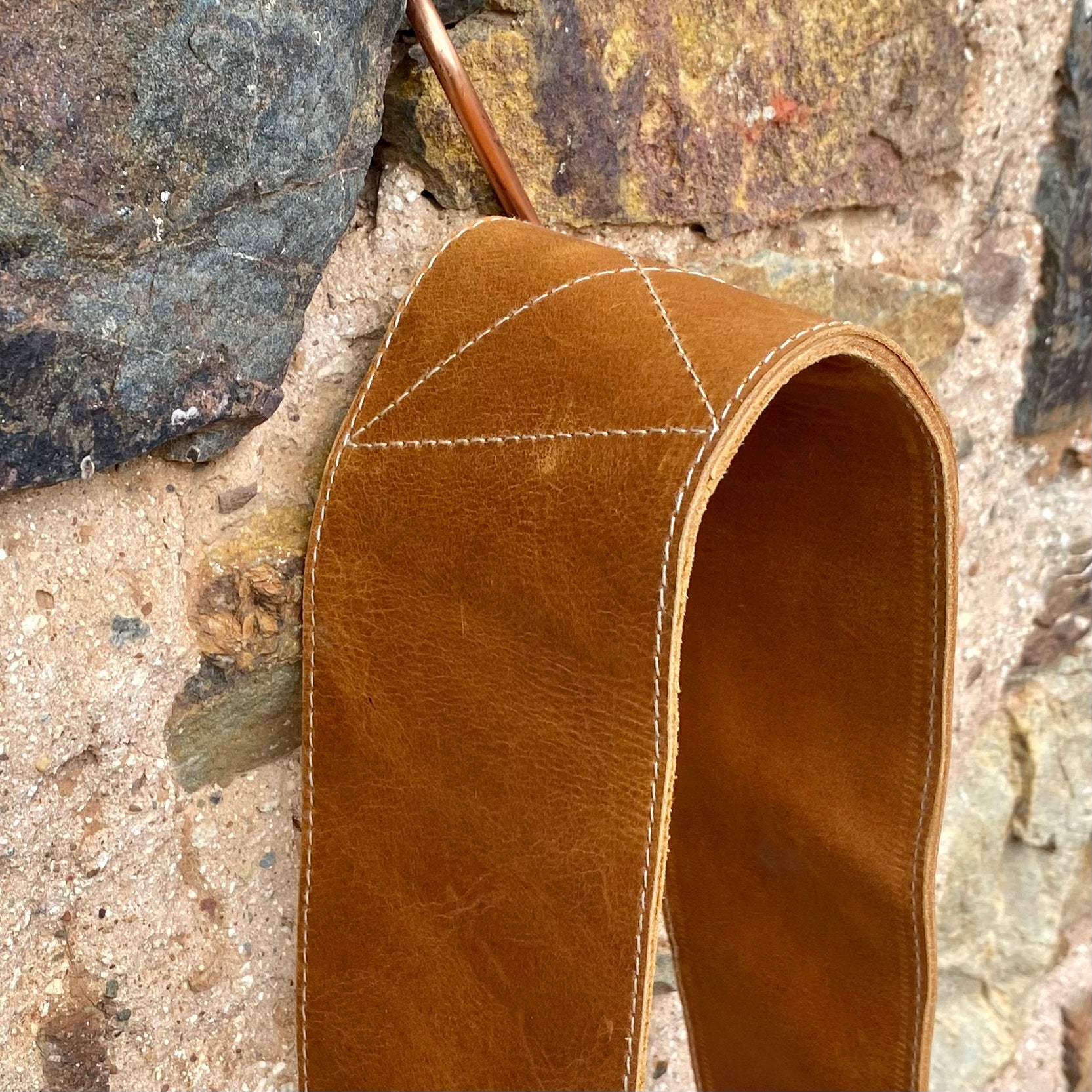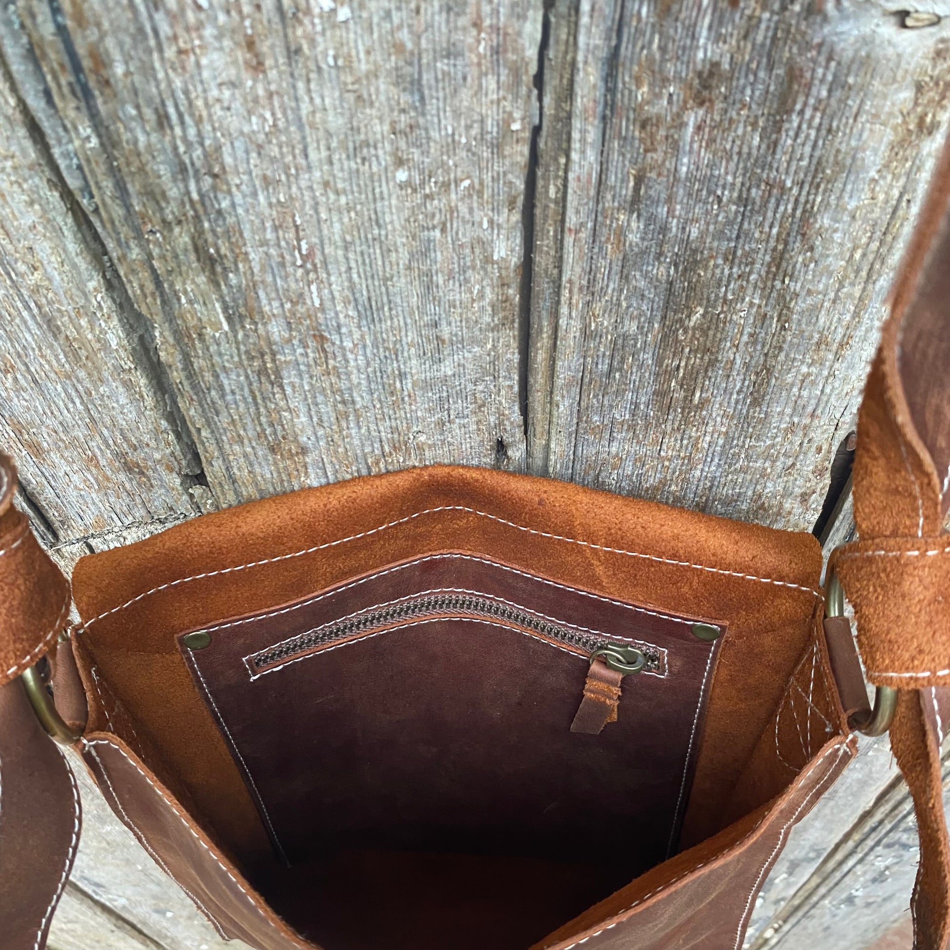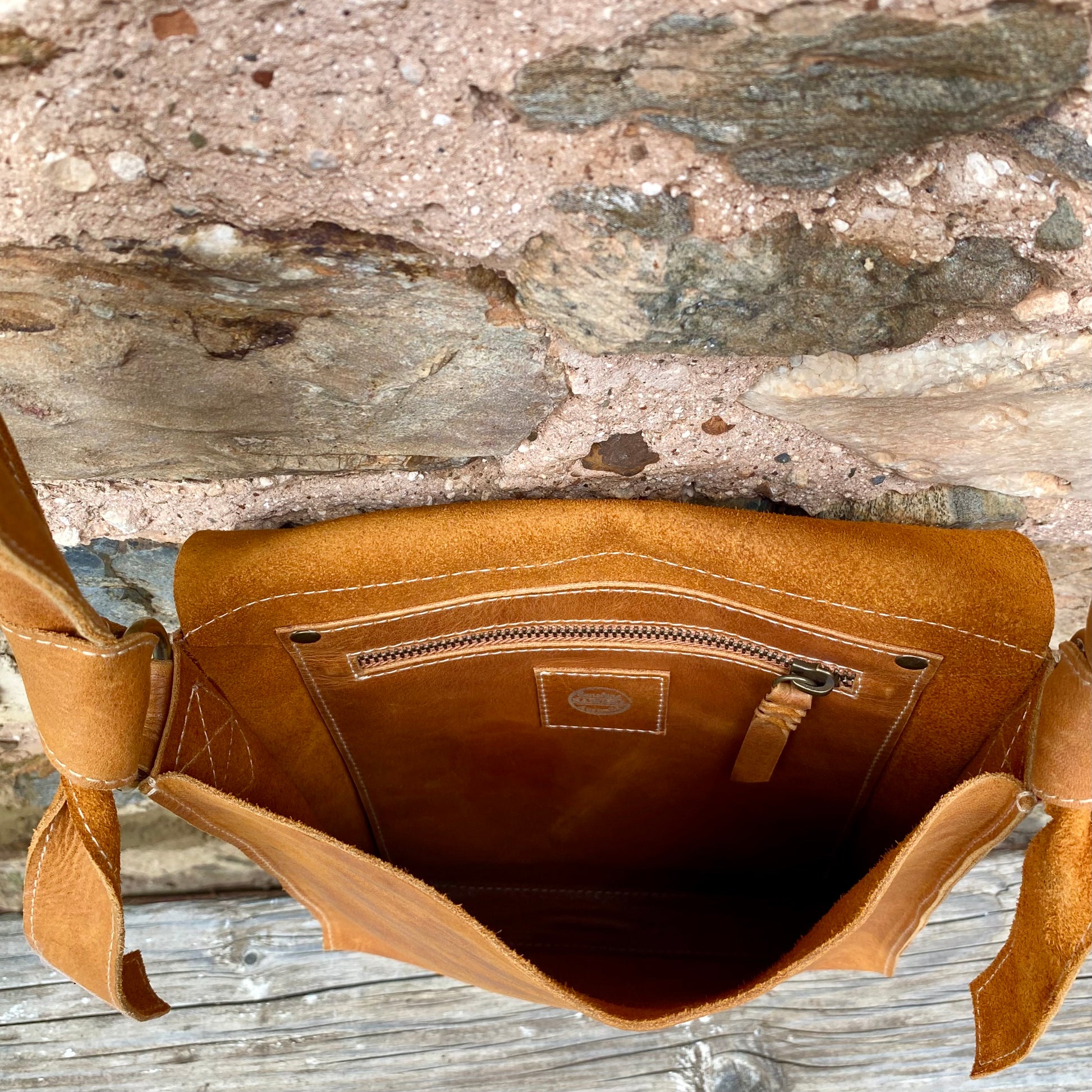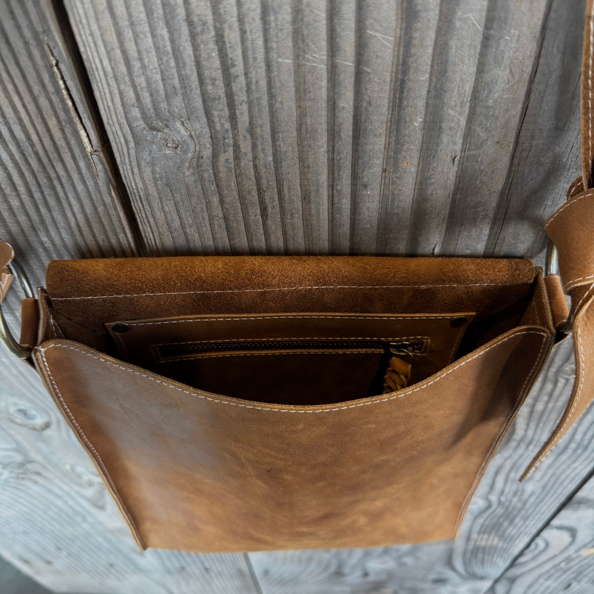 These satchels sit across the body with ease with a wide leather strap for comfort. The straps are wider in the middle and tapered towards the ends so they can be knotted onto the antique brass rings. This is the way you adjust the strap to suit exactly how you want to wear it and the soft durable leather will mold to your body to give you a very comfortable-to-wear bag.