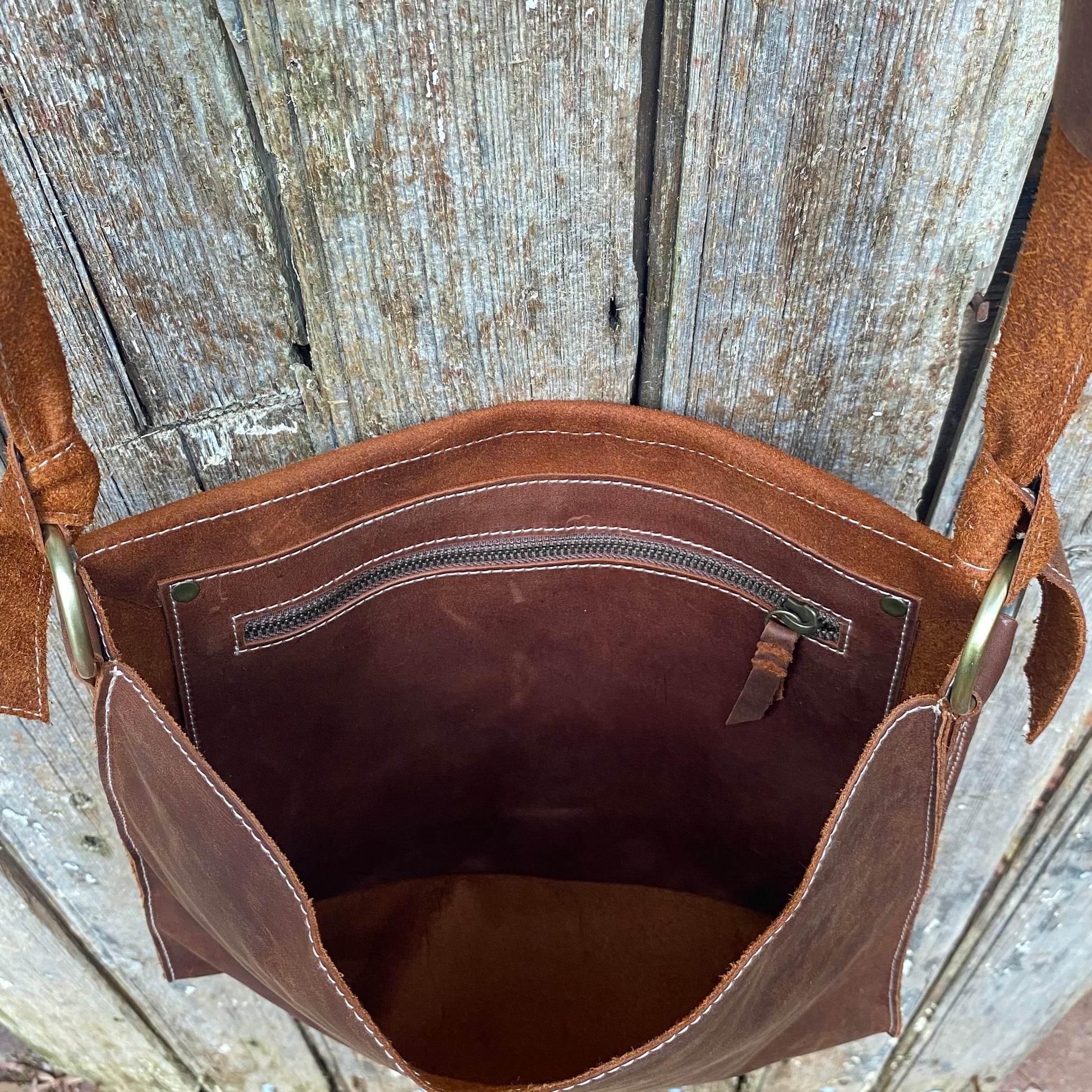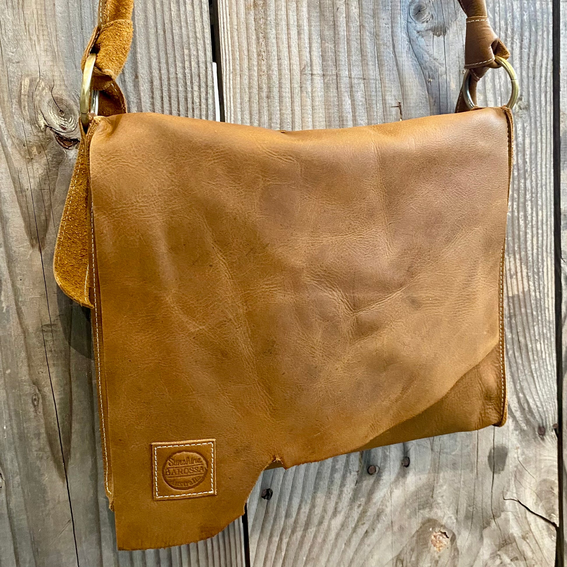 This gorgeous first design made by Sunshine Barossa Australia is nicknamed the "Carol bag" by the crafters. Its use of amazing buttery soft leathers, solid antique brass rings and the natural raw edge of the leather hide used on the flap gives every bag its own one-of-a-kind uniqueness. Now in two sizes due to popular demand. Carol, owner and designer personally chooses these unique leathers with raw edges to create its stand-out beauty.