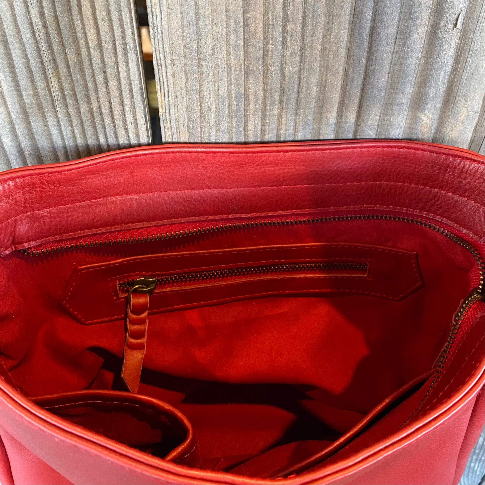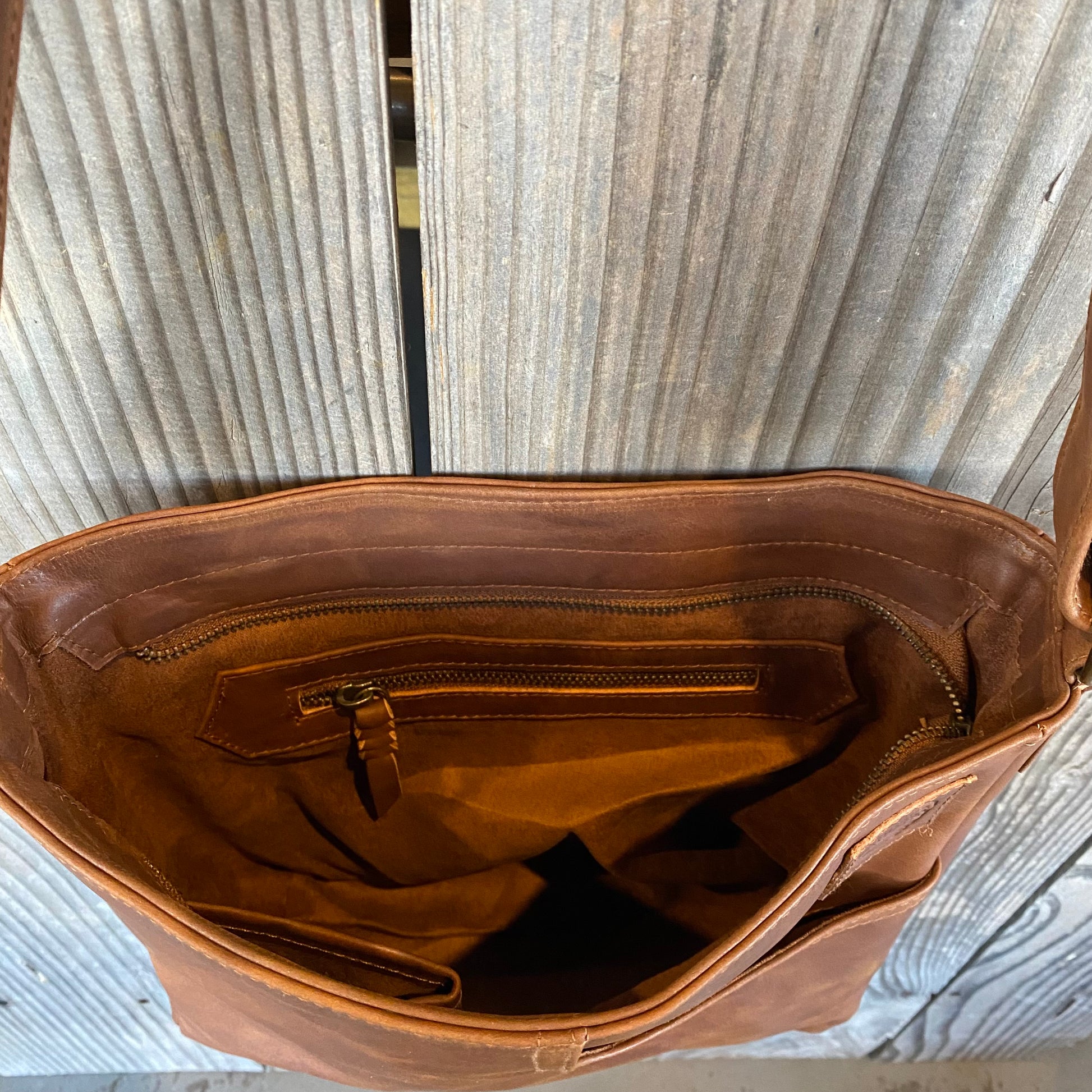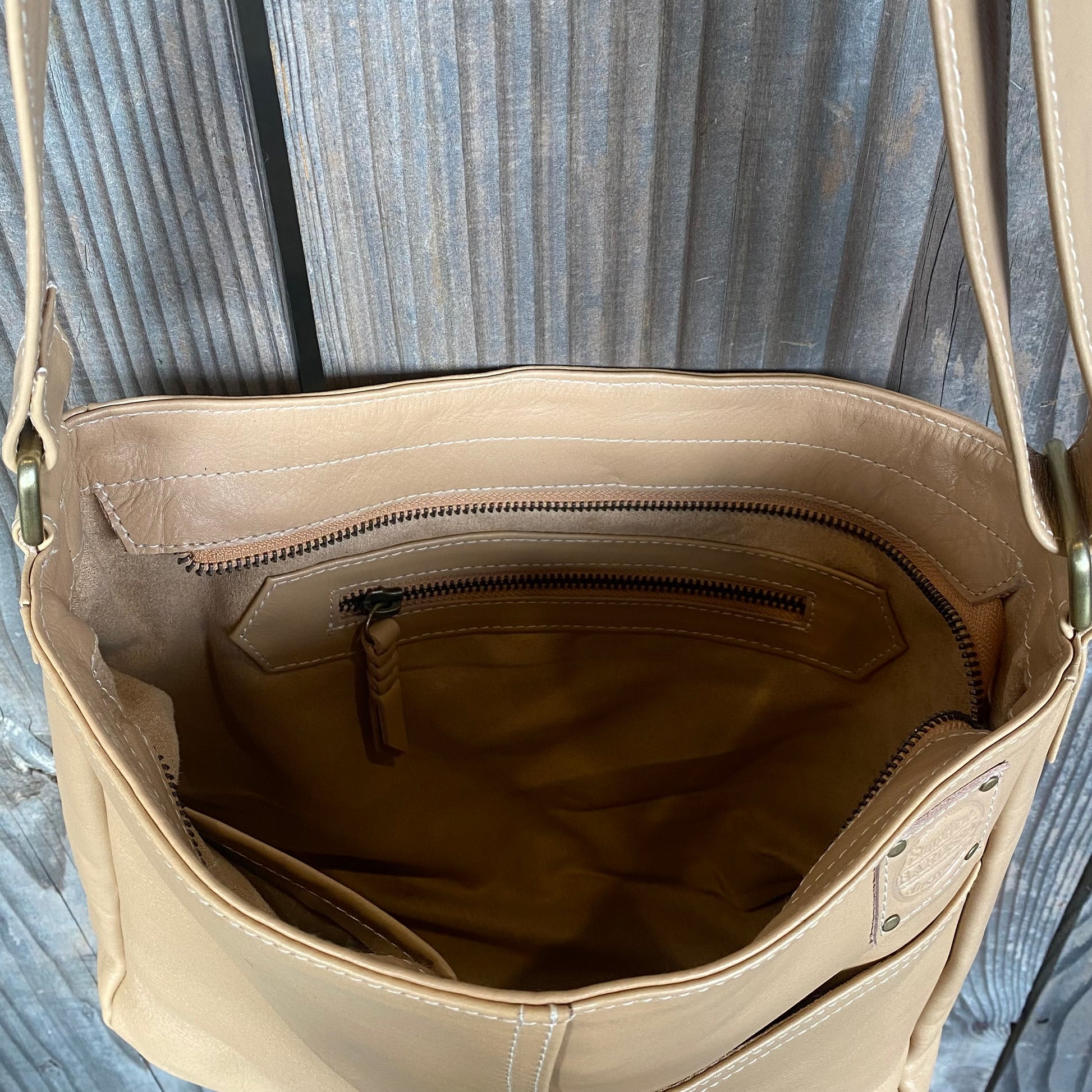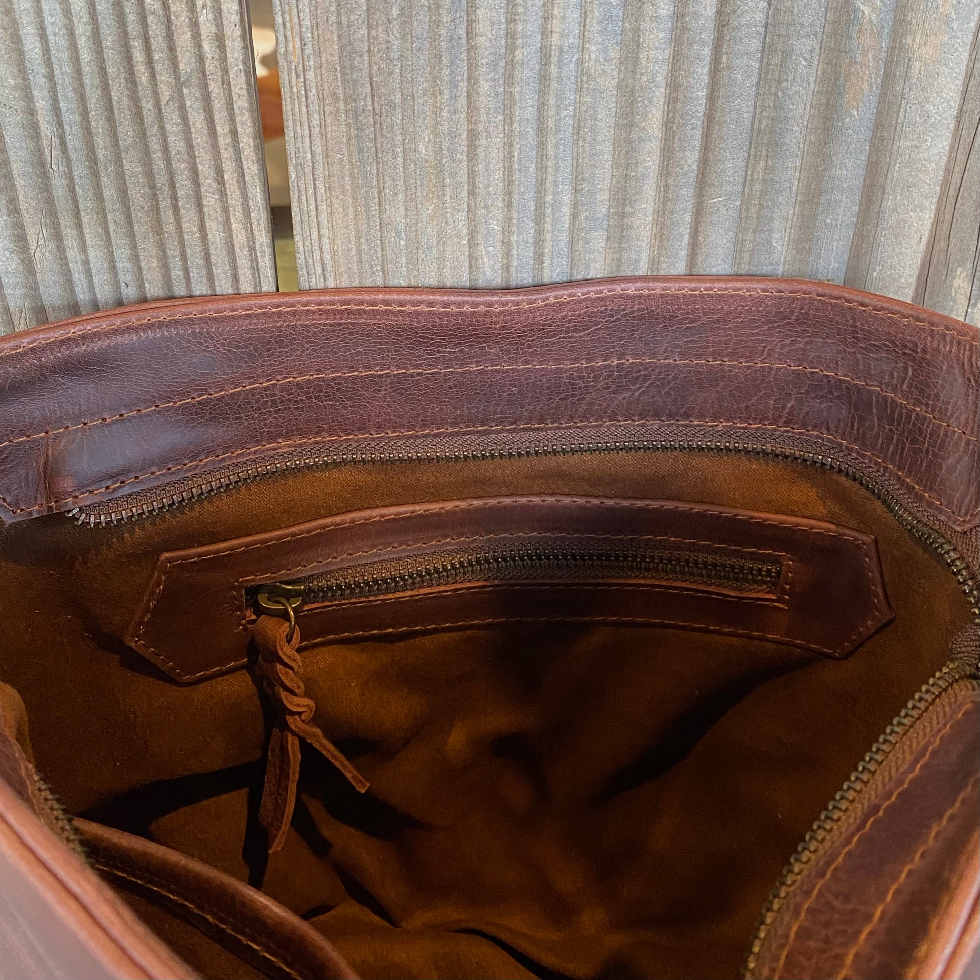 Internal metal zippered pocket 15cm wide with plated leather pull