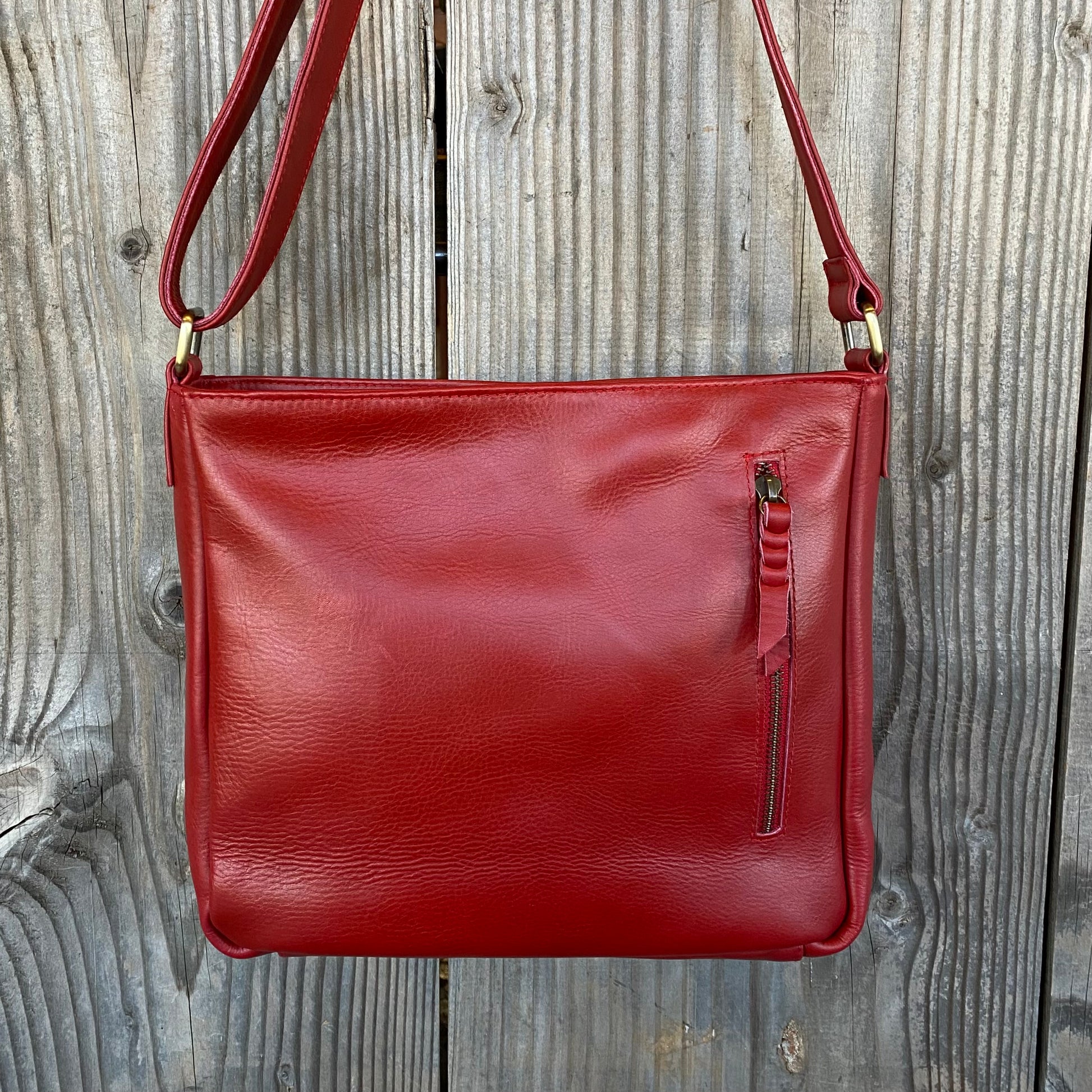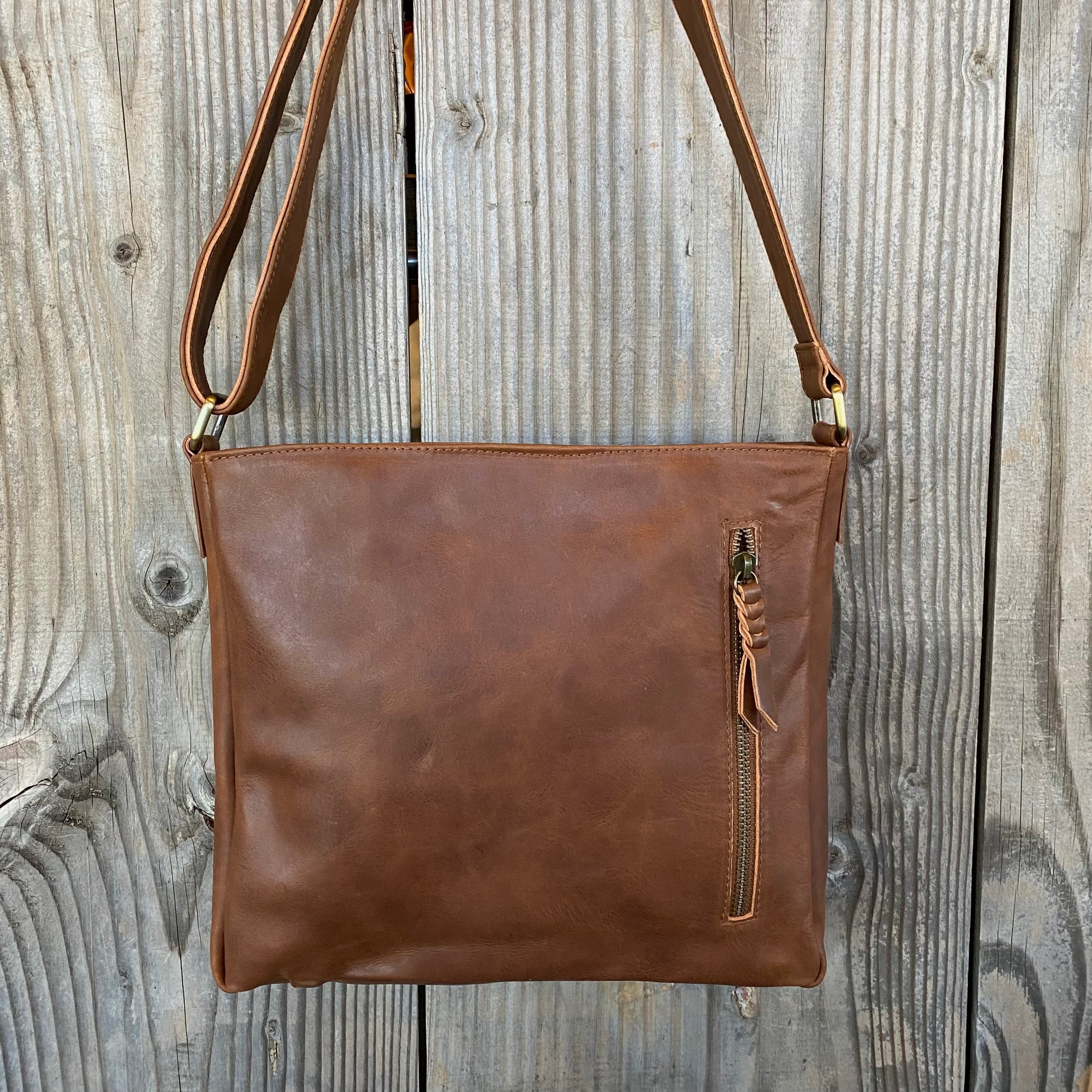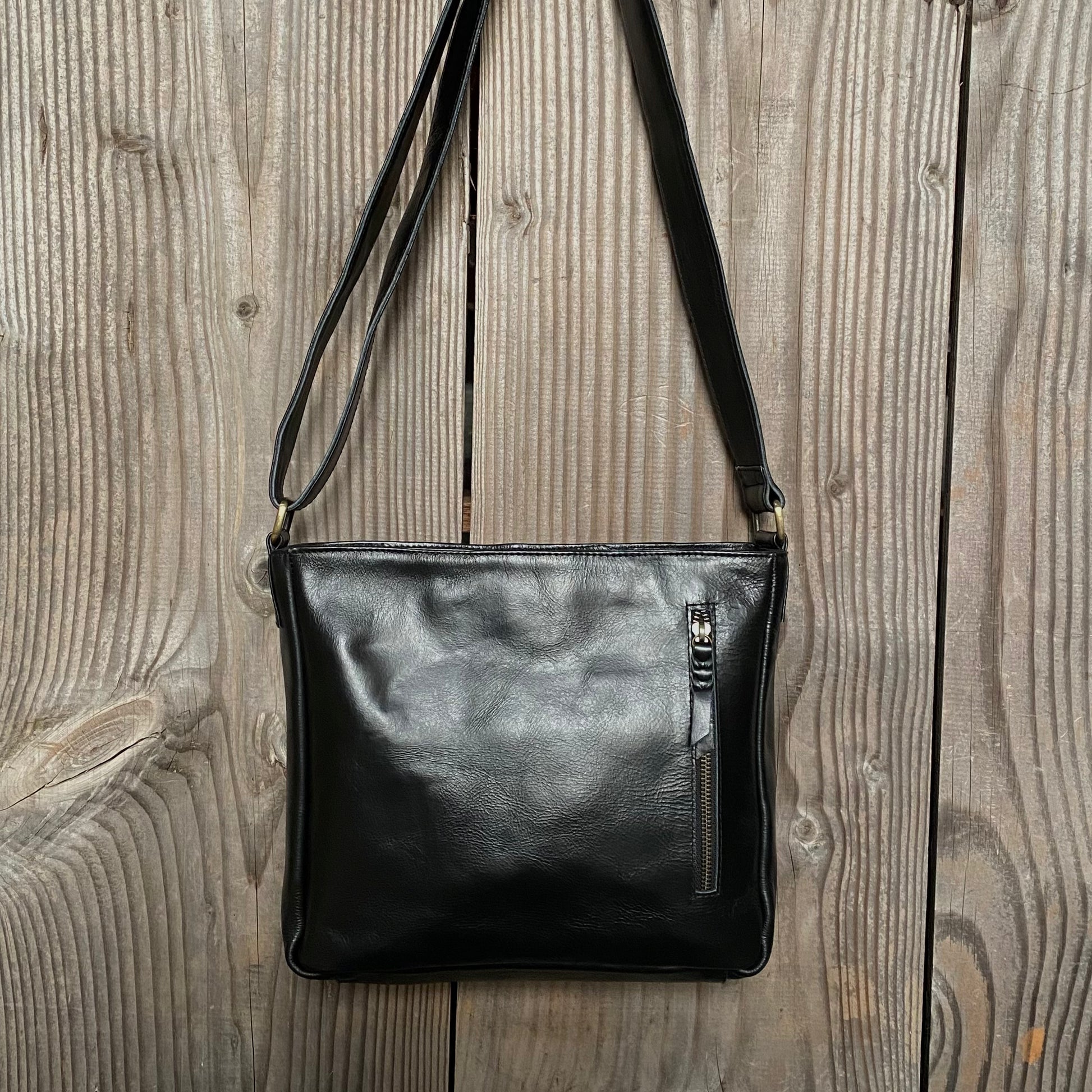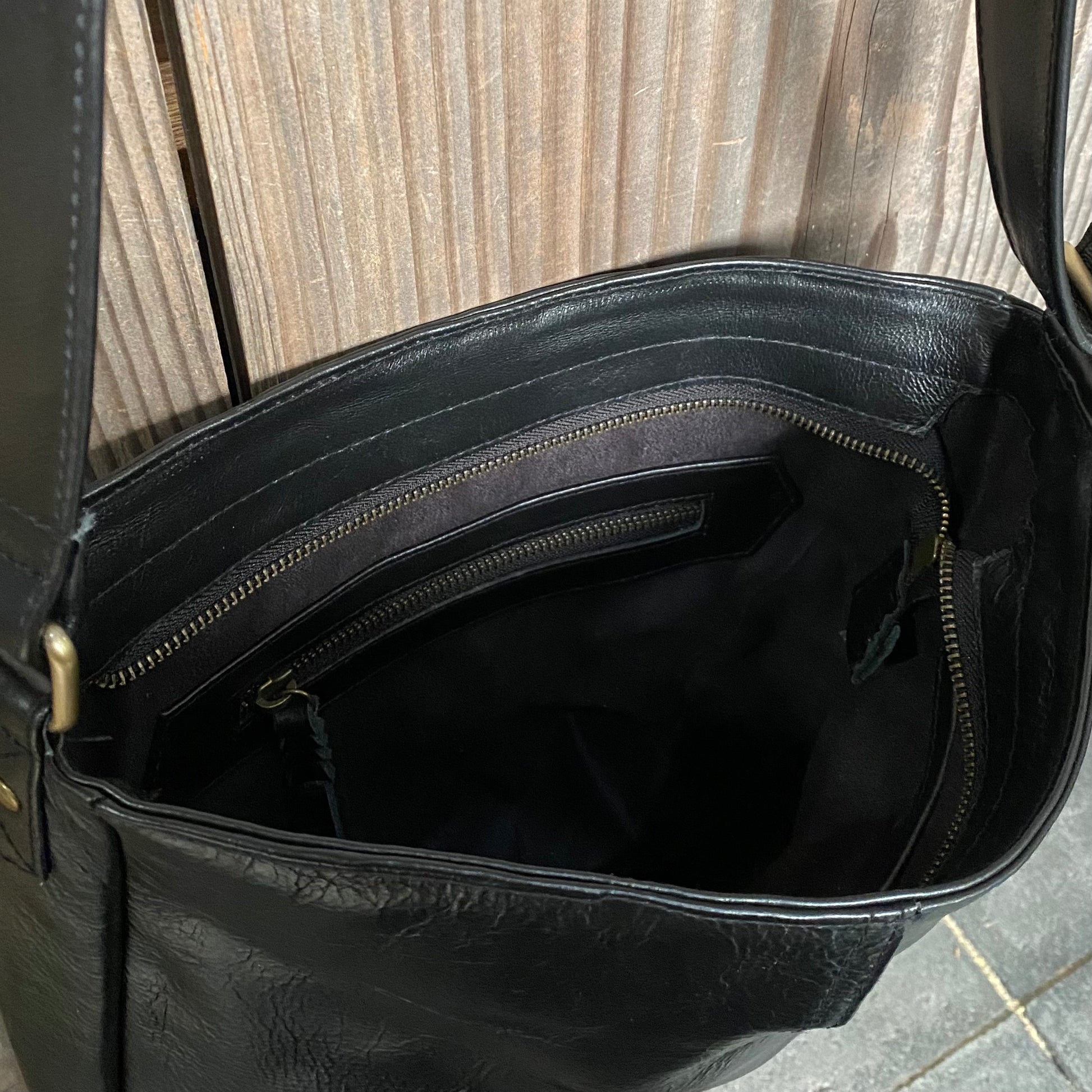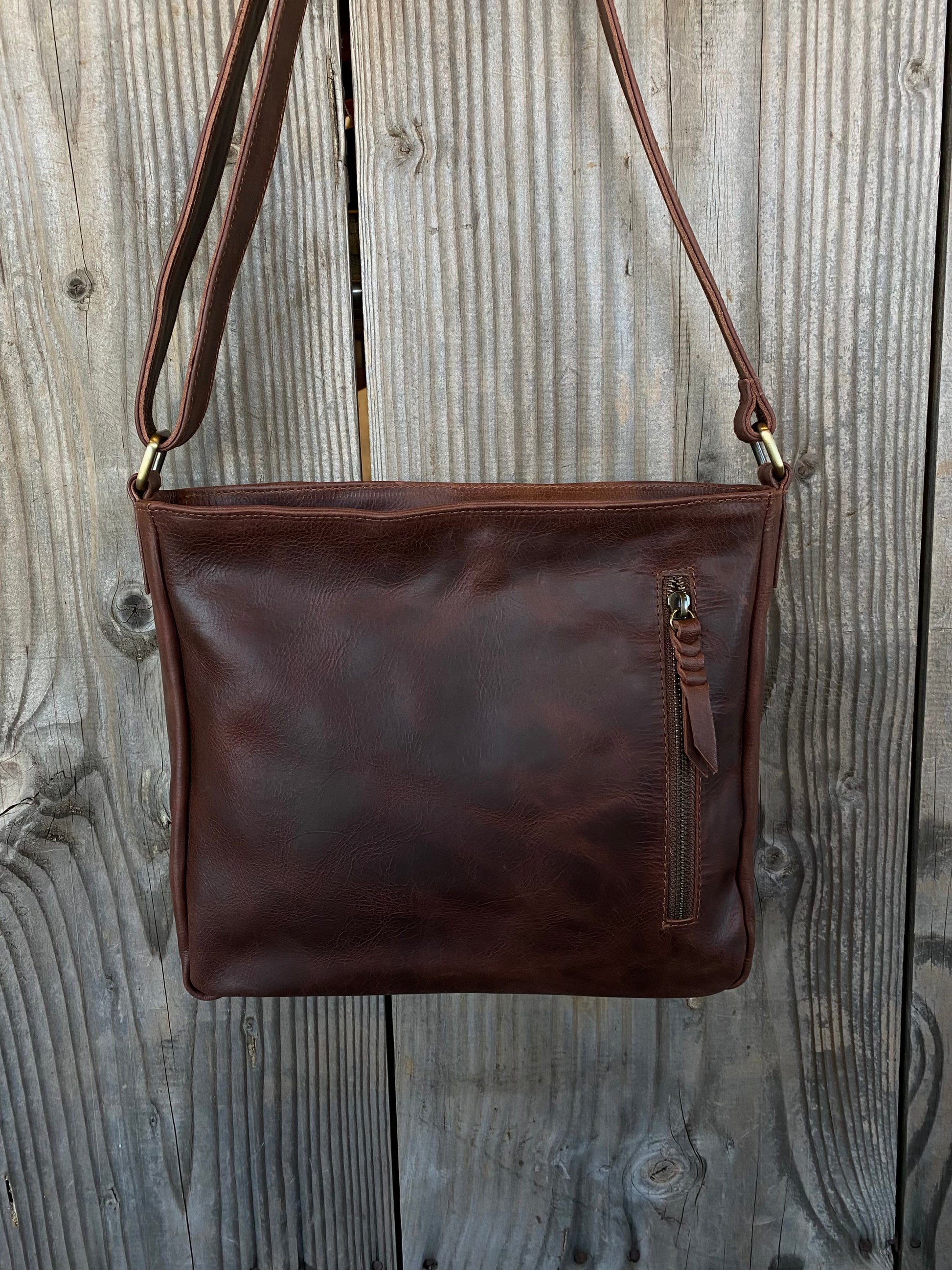 Internal metal zippered pocket 15cm wide with plated leather pull