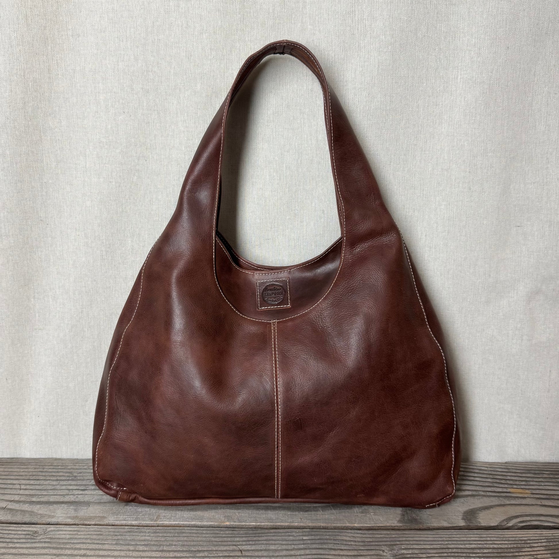 1. a soft leather slouch style bag with a fixed strap designed to fit comfortably around your shoulder.