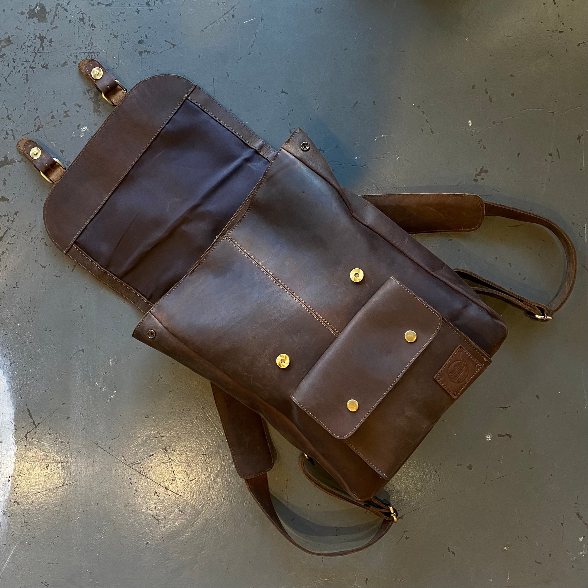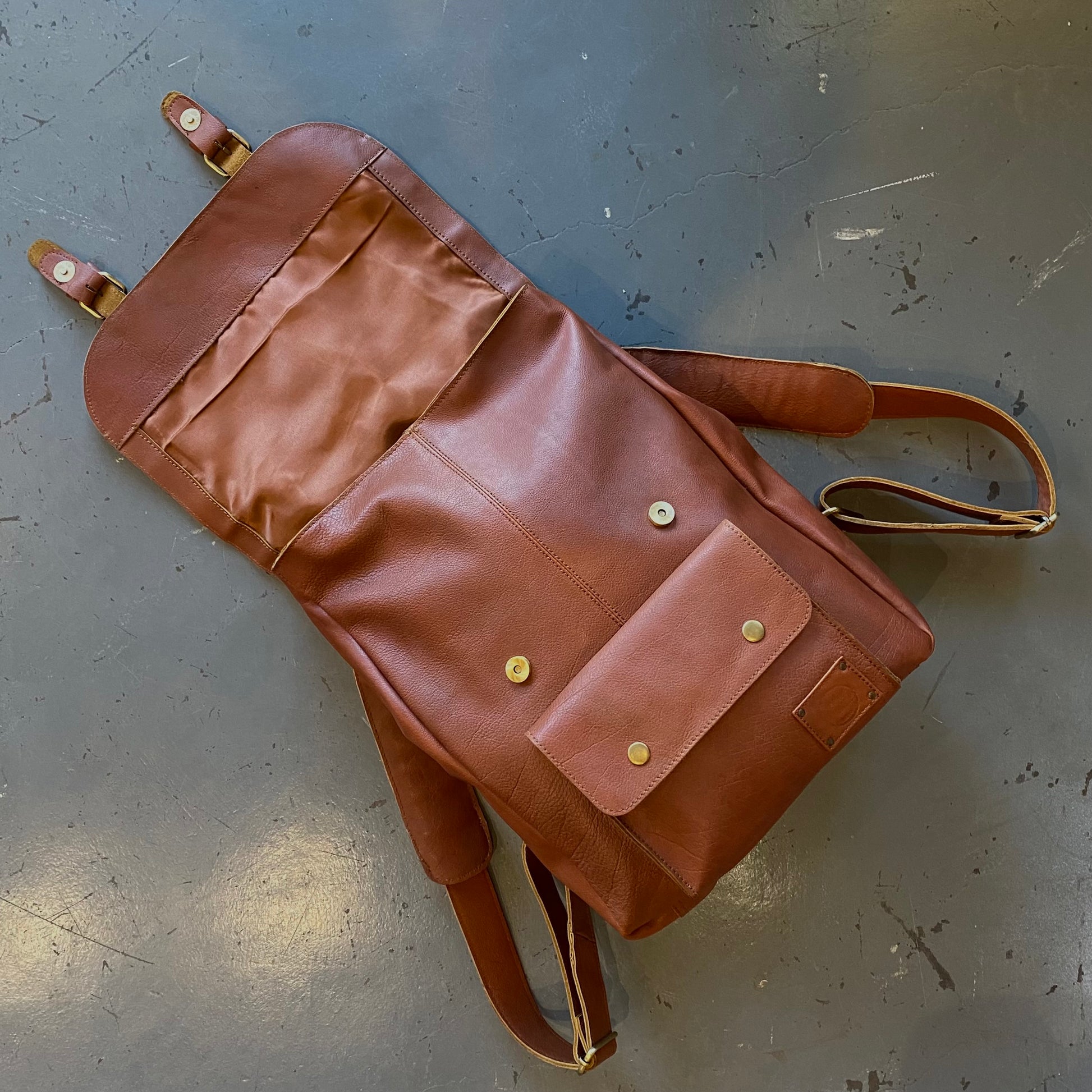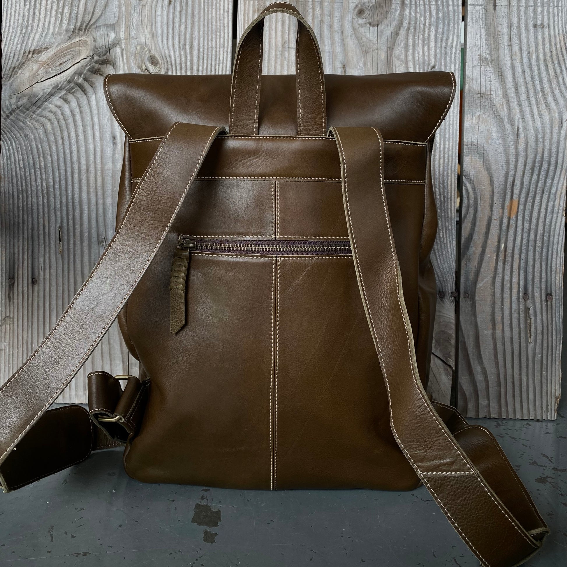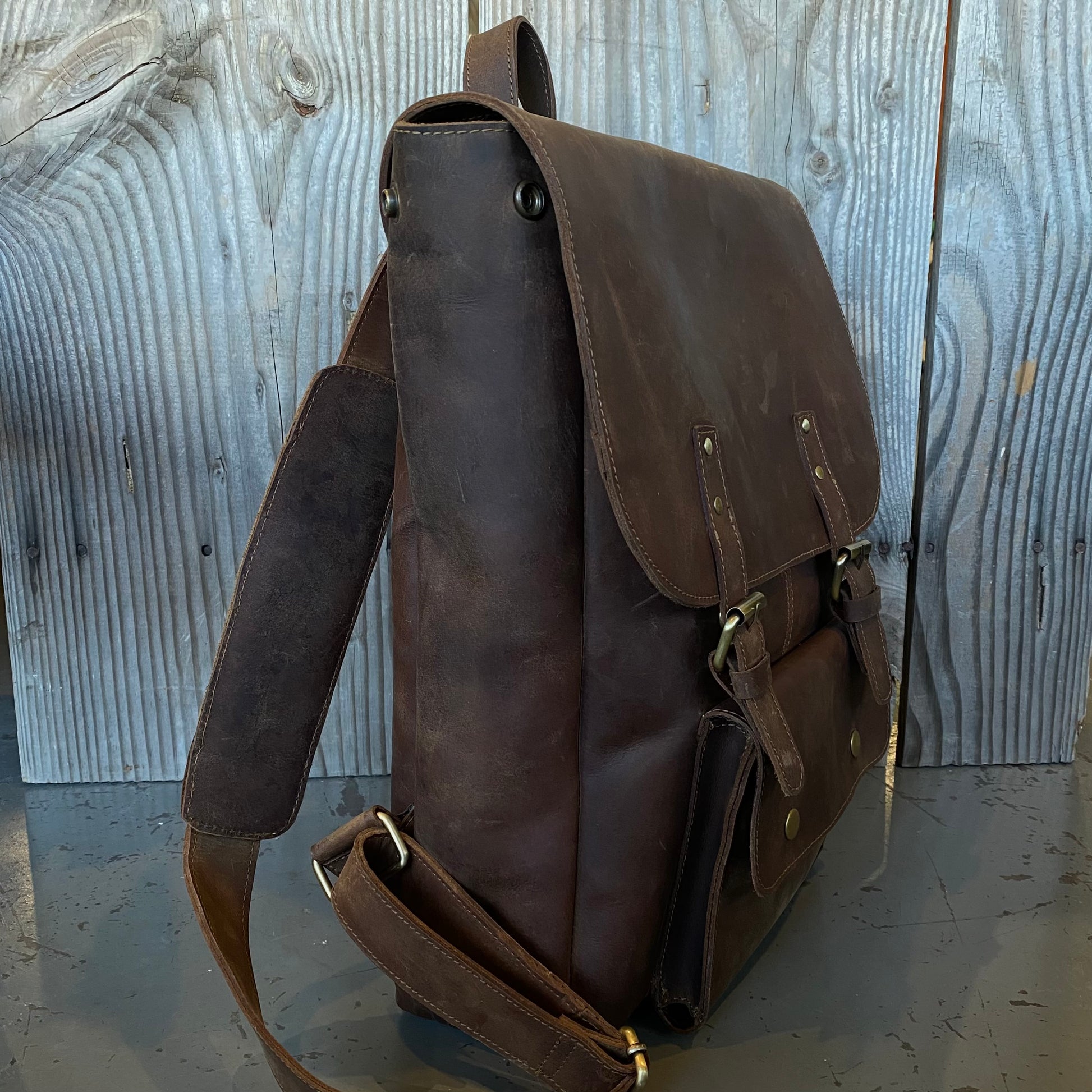 1. a leather bag that is designed to be used for carrying your belongings while being worn on the back by 2 adjustable straps.