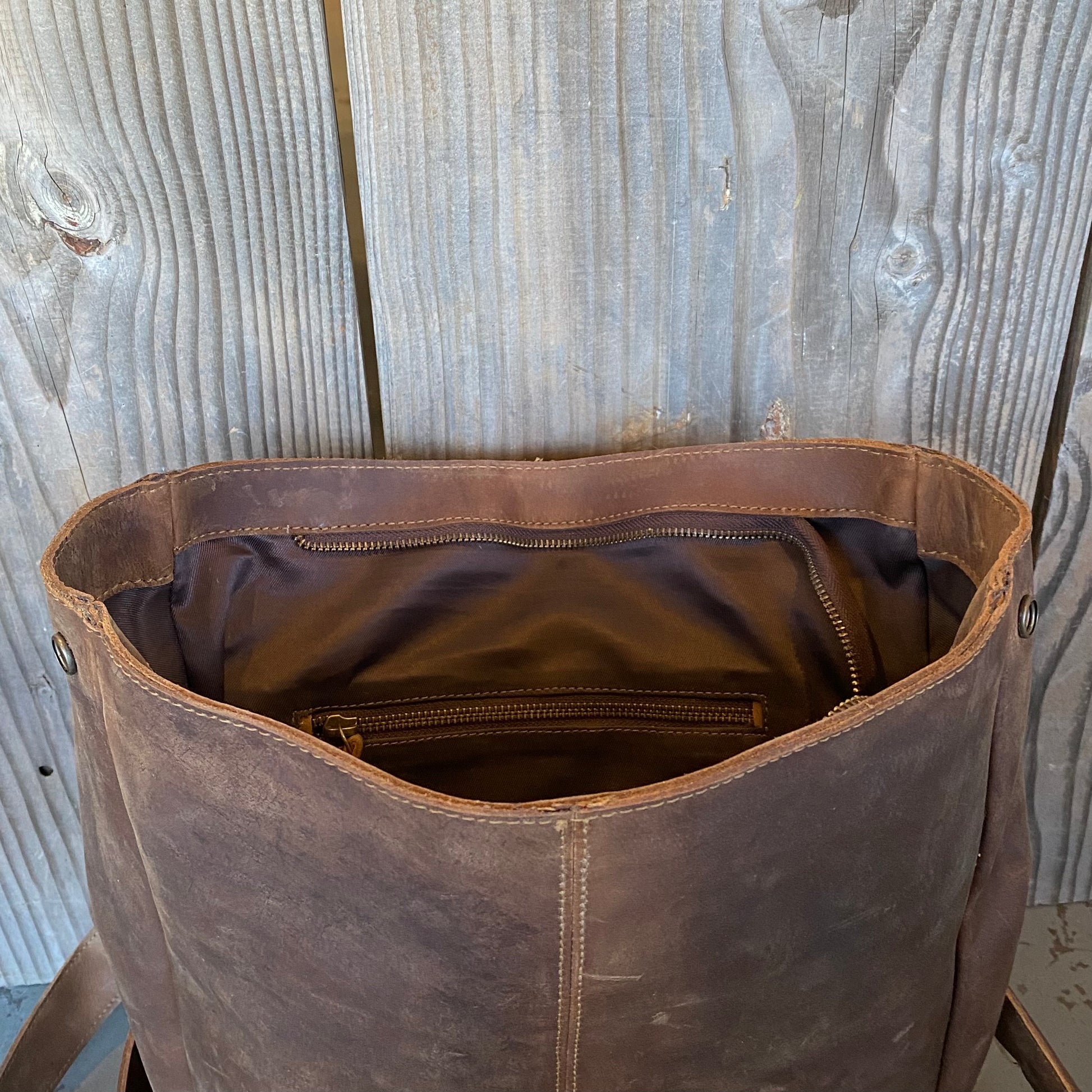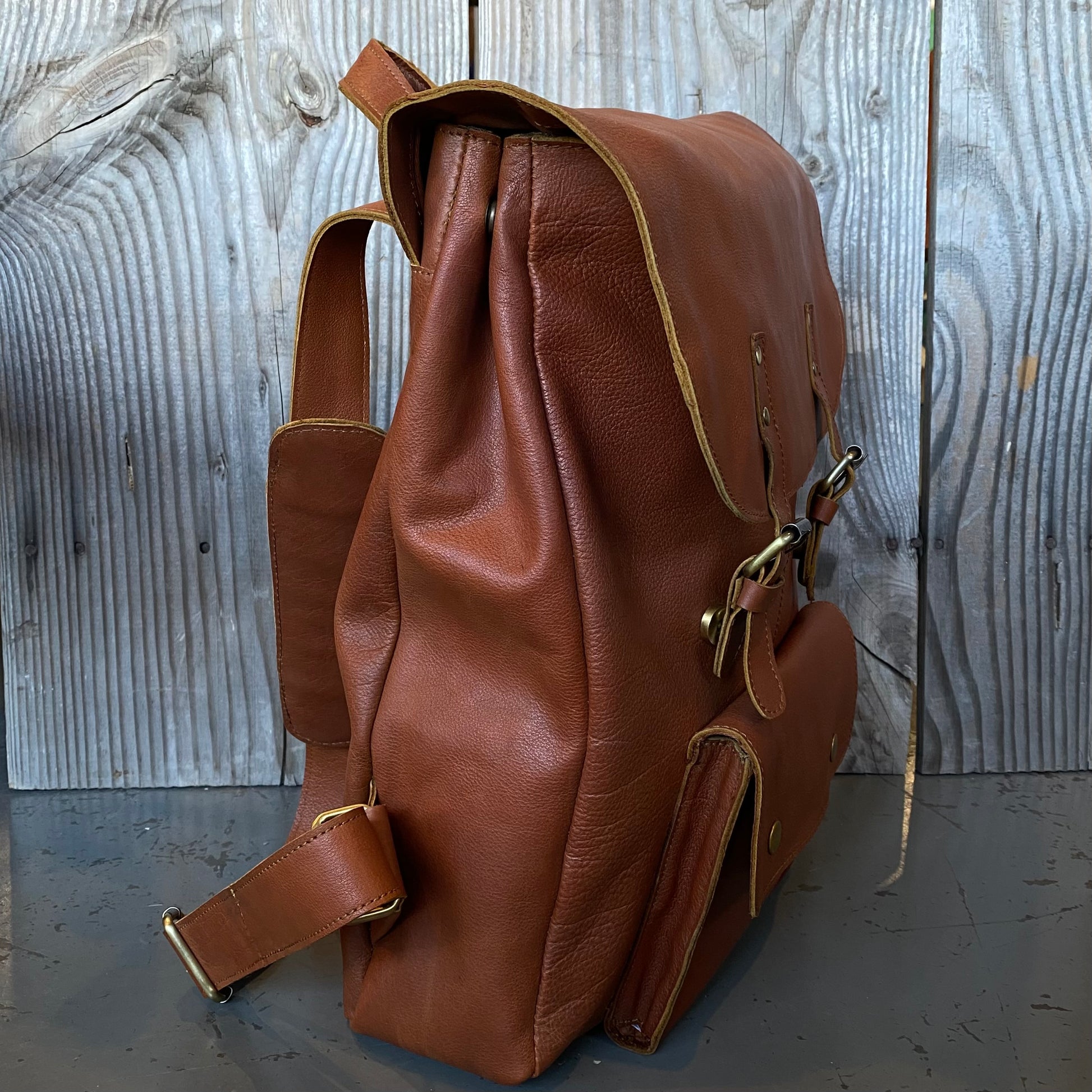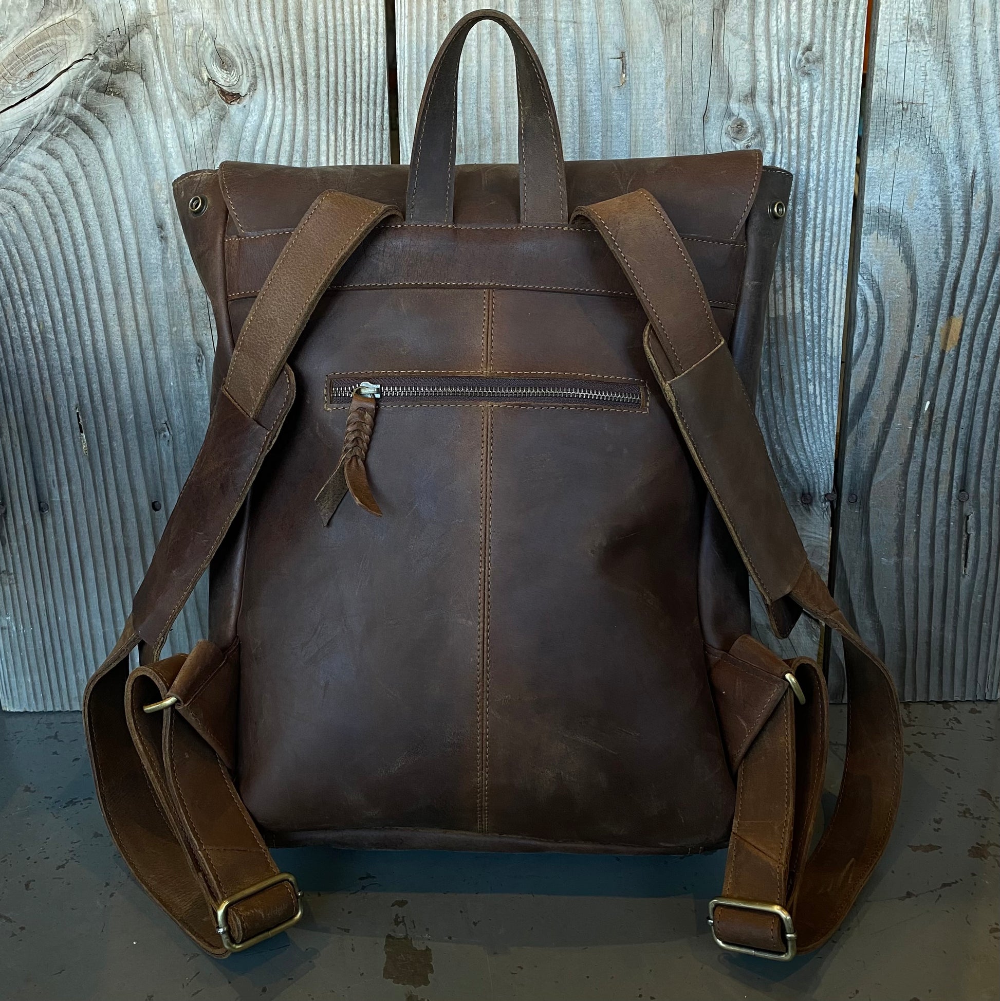 1. a leather bag that is designed to be used for carrying your belongings while being worn on the back by 2 adjustable straps.