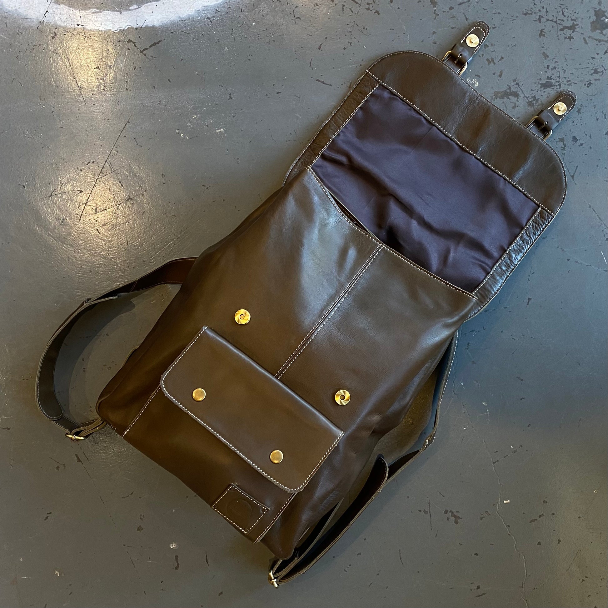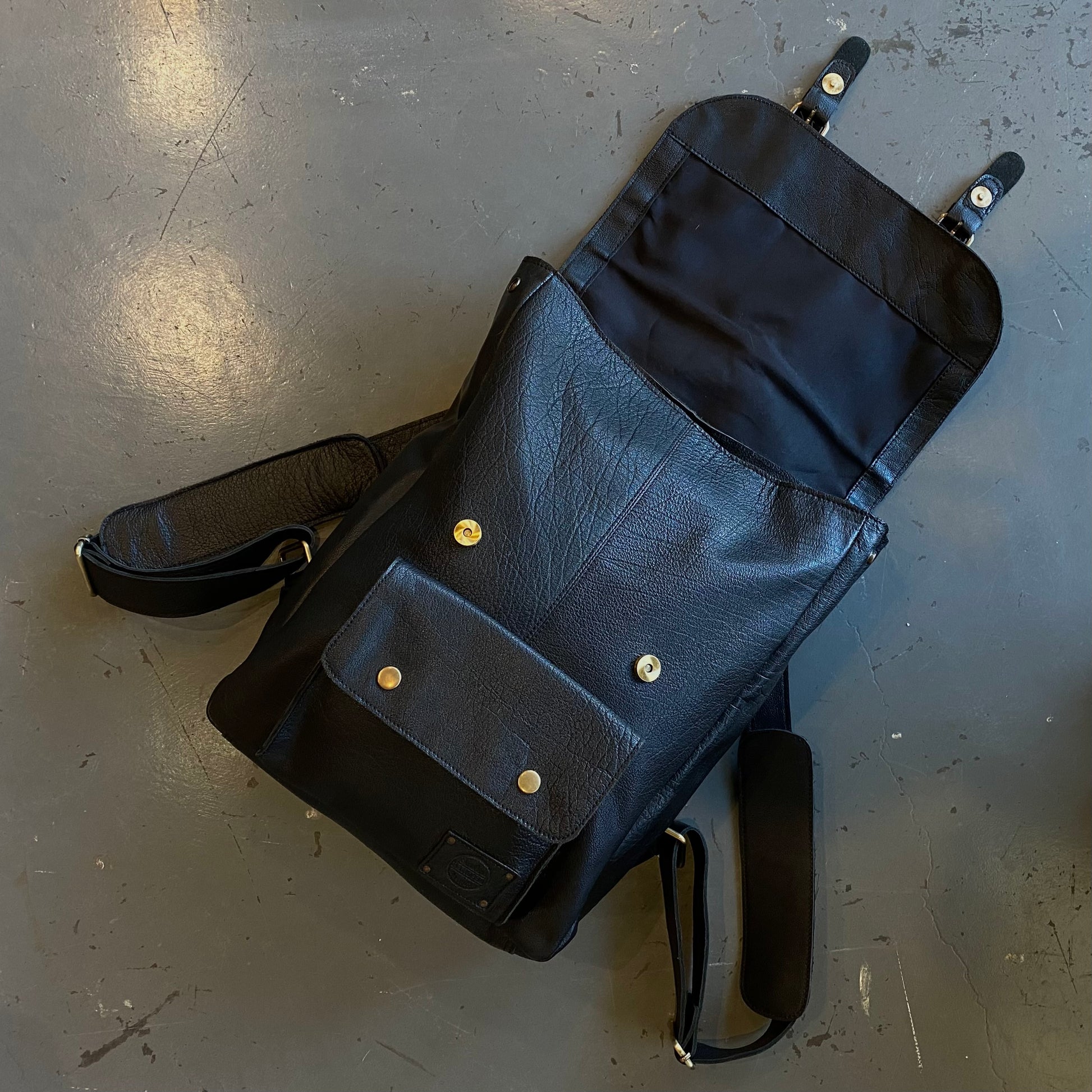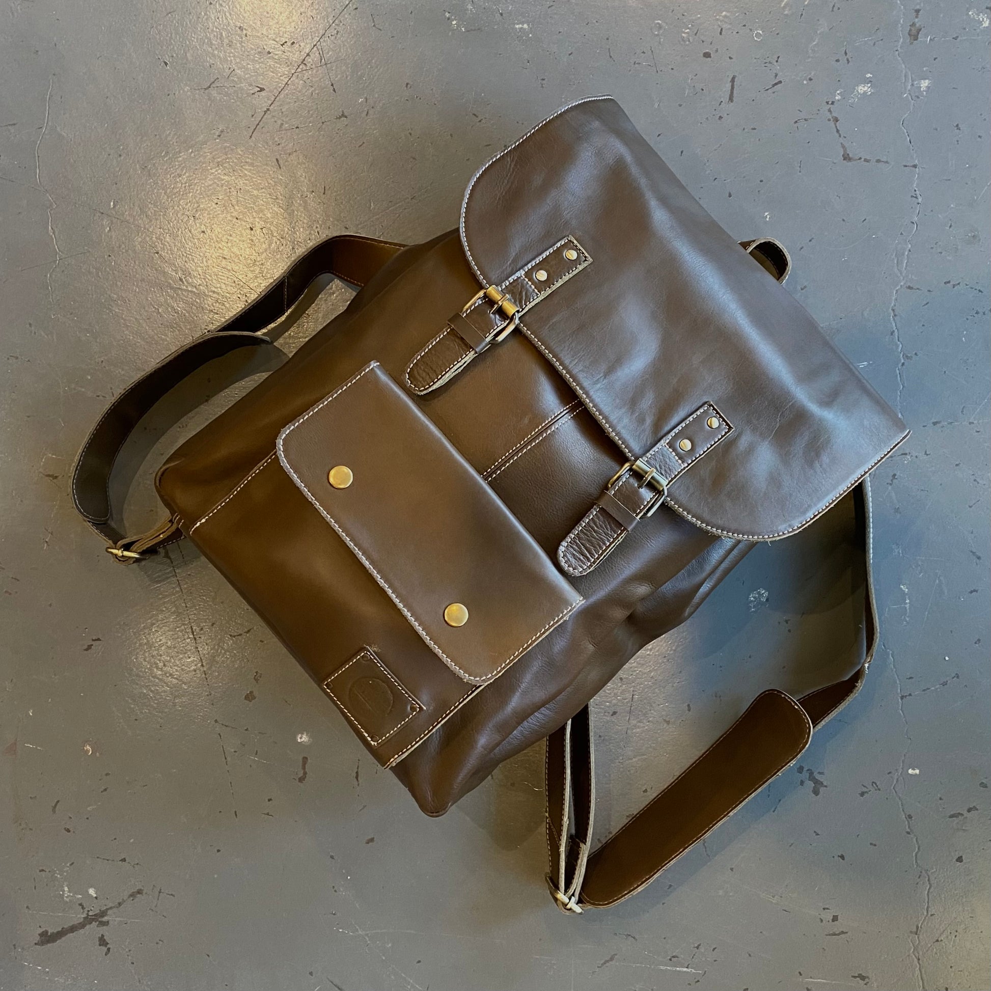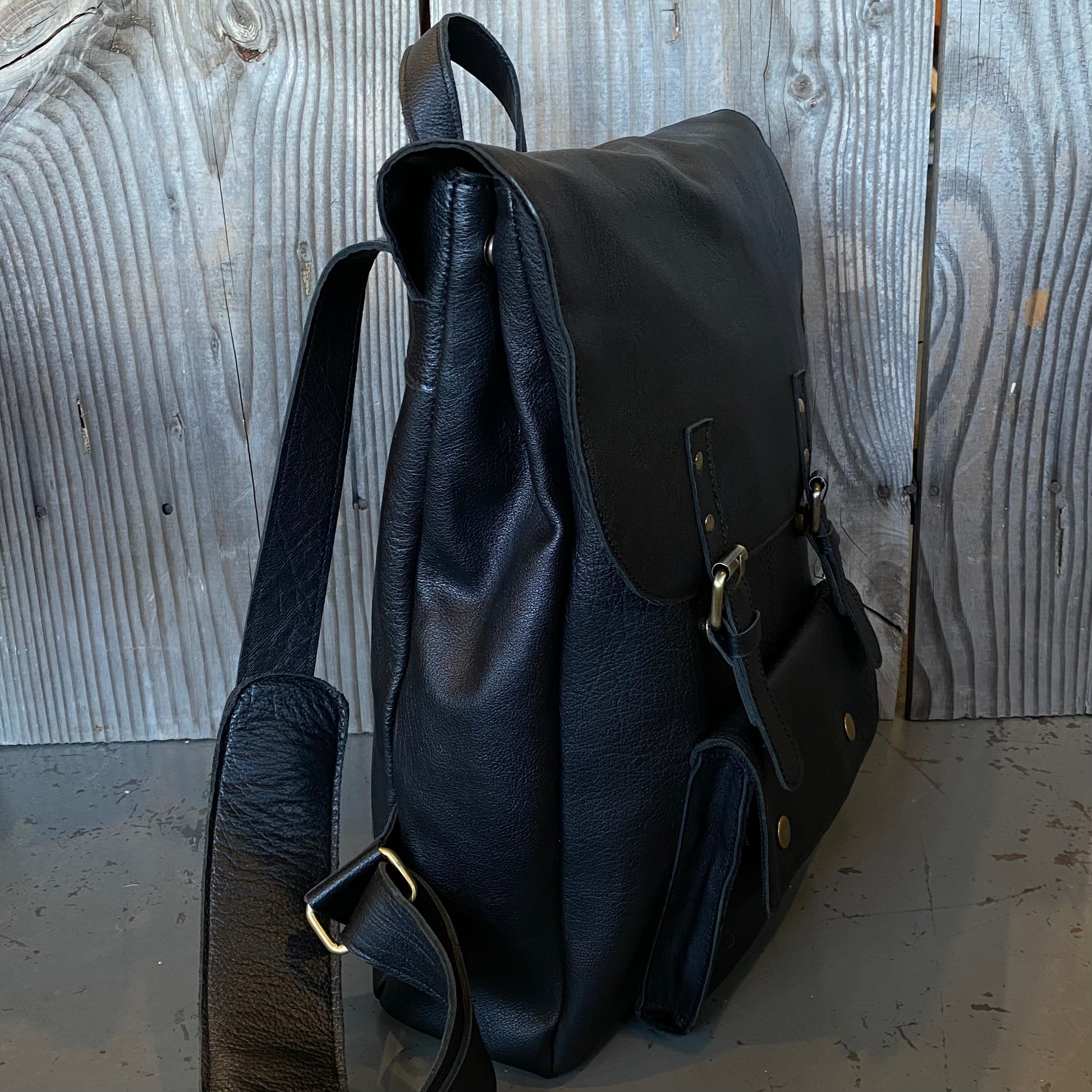 1. a leather bag that is designed to be used for carrying your belongings while being worn on the back by 2 adjustable straps.